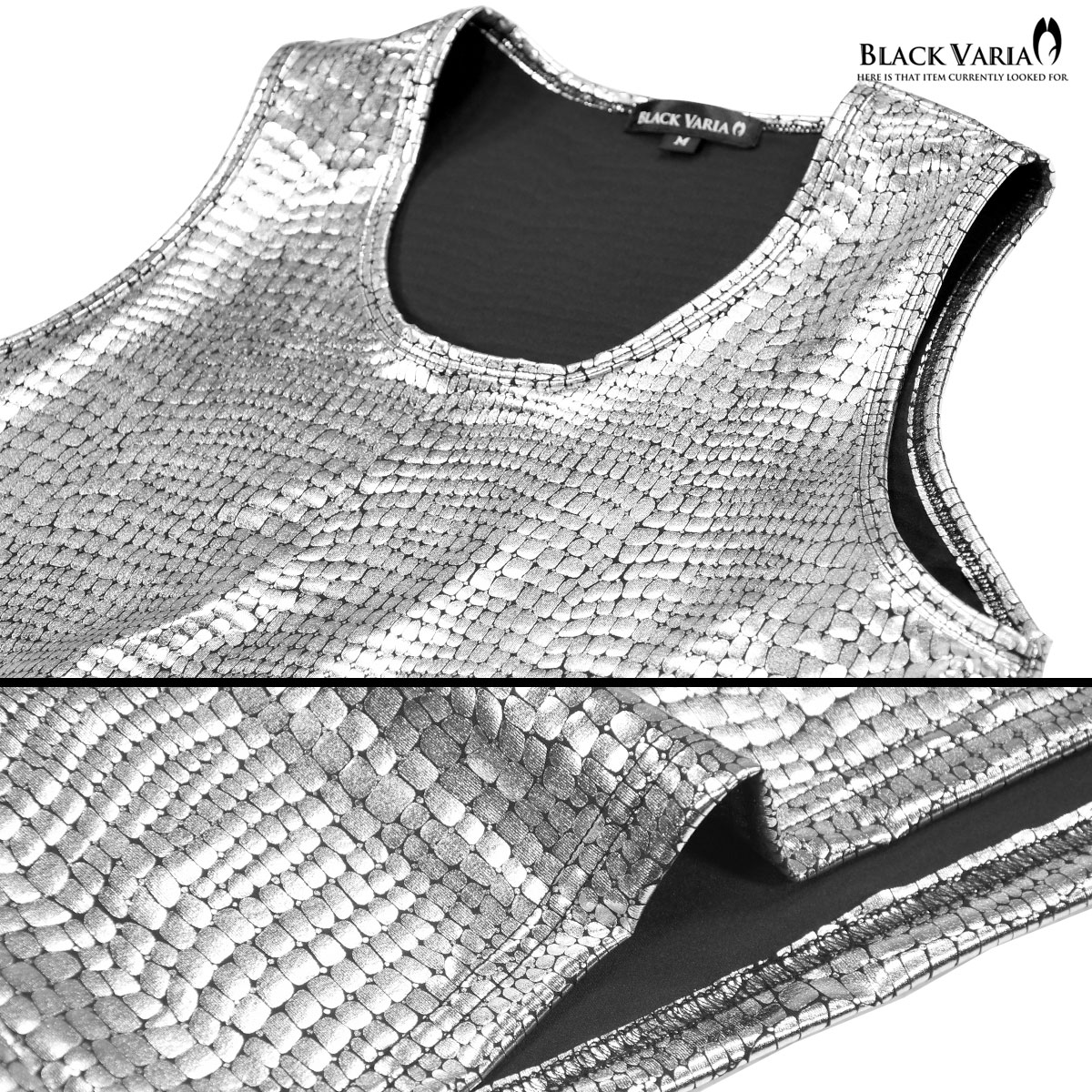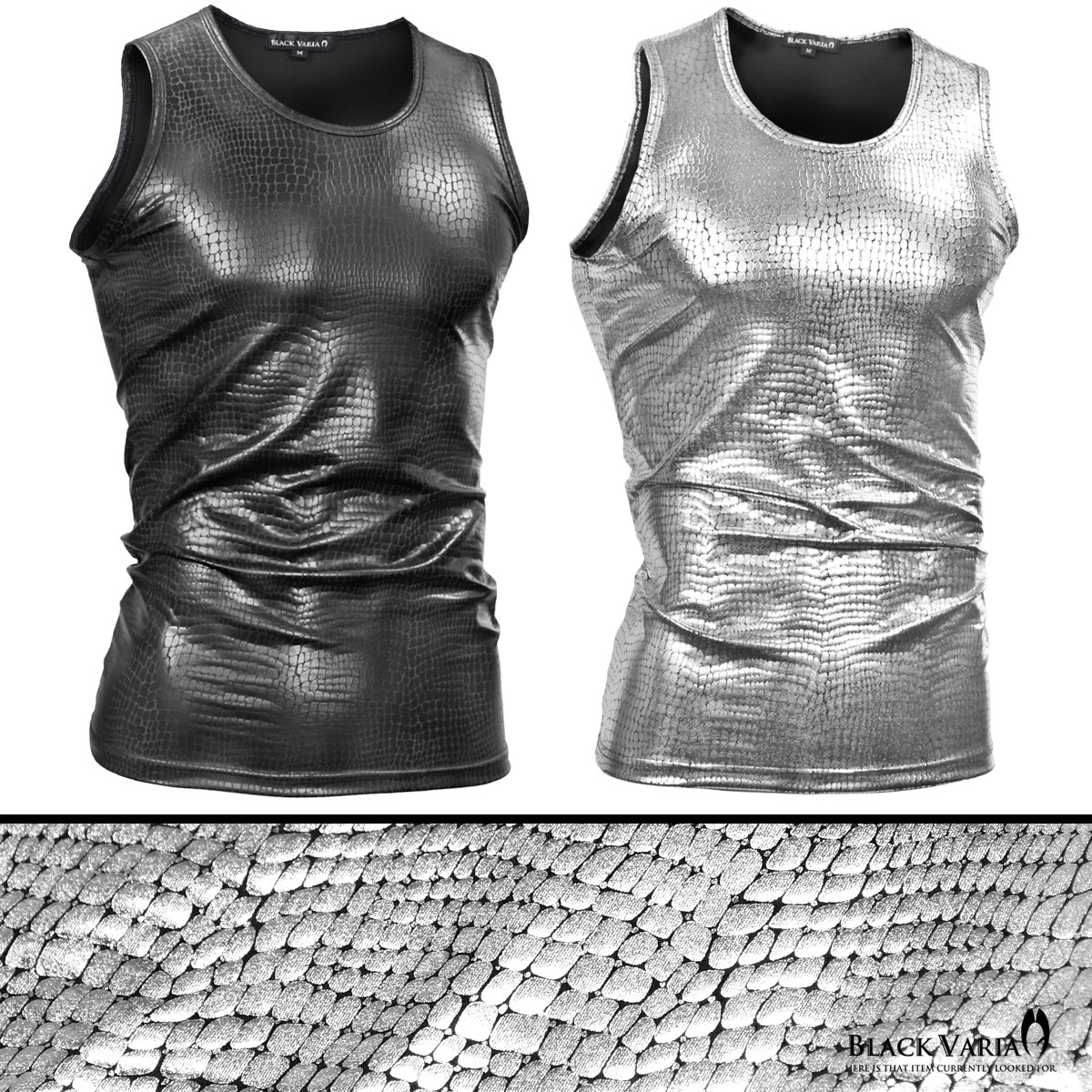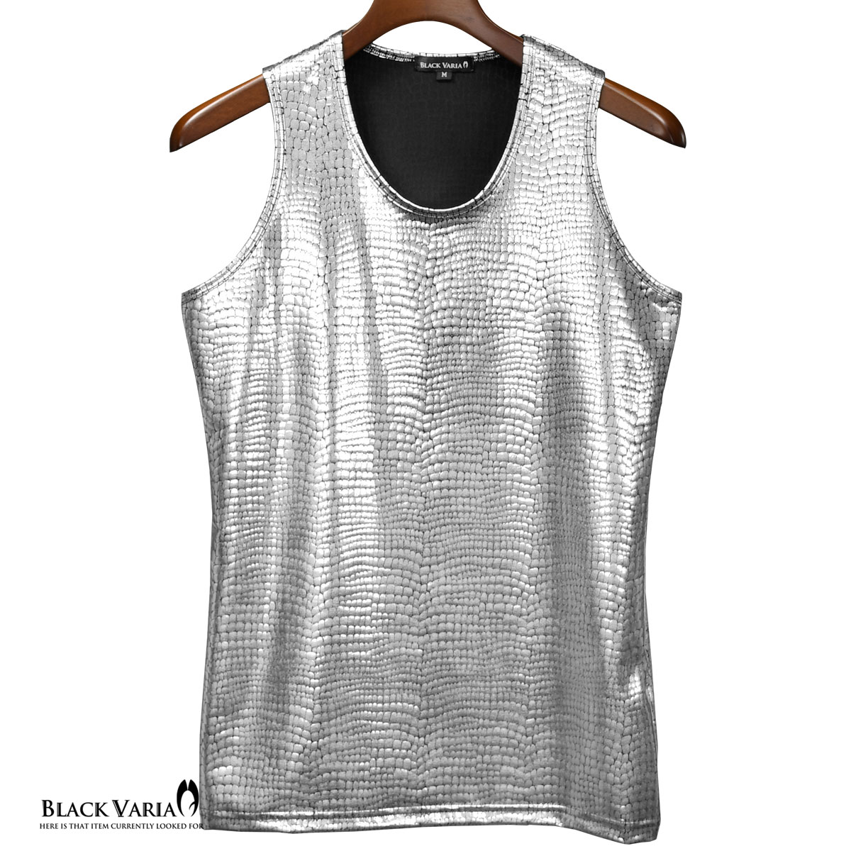 タンクトップ クロコダイル 箔プリント メンズ 光沢 総柄 日本製 ストレッチ 細身 タンク mens ファッション おしゃれ (シルバー銀) 193806