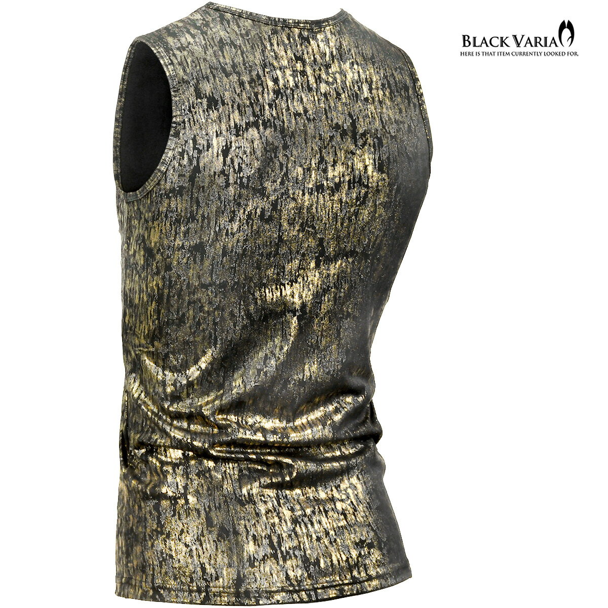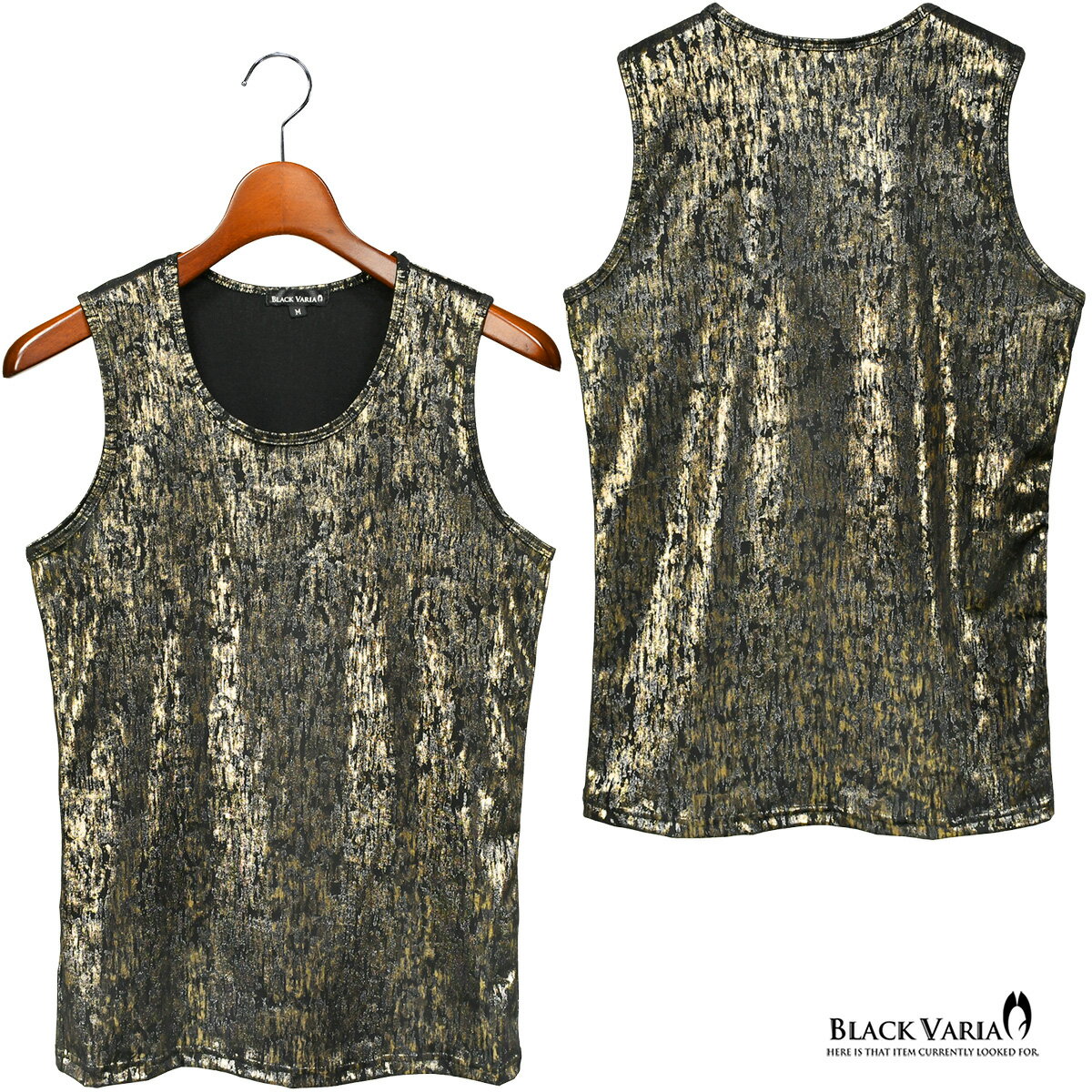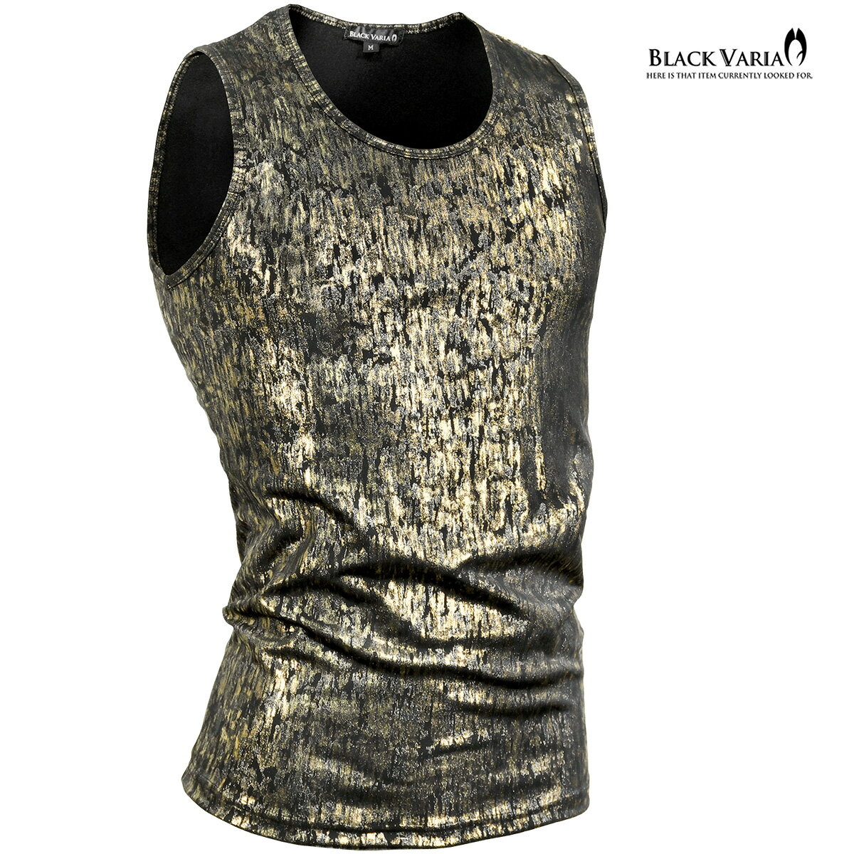 タンクトップ ムラ柄 箔プリント ゴールド×シルバー メンズ ストレッチ 光沢 細身 タンク mens ファッション おしゃれ (ゴールド金ブラック黒) 213703