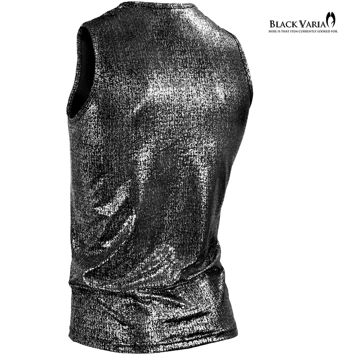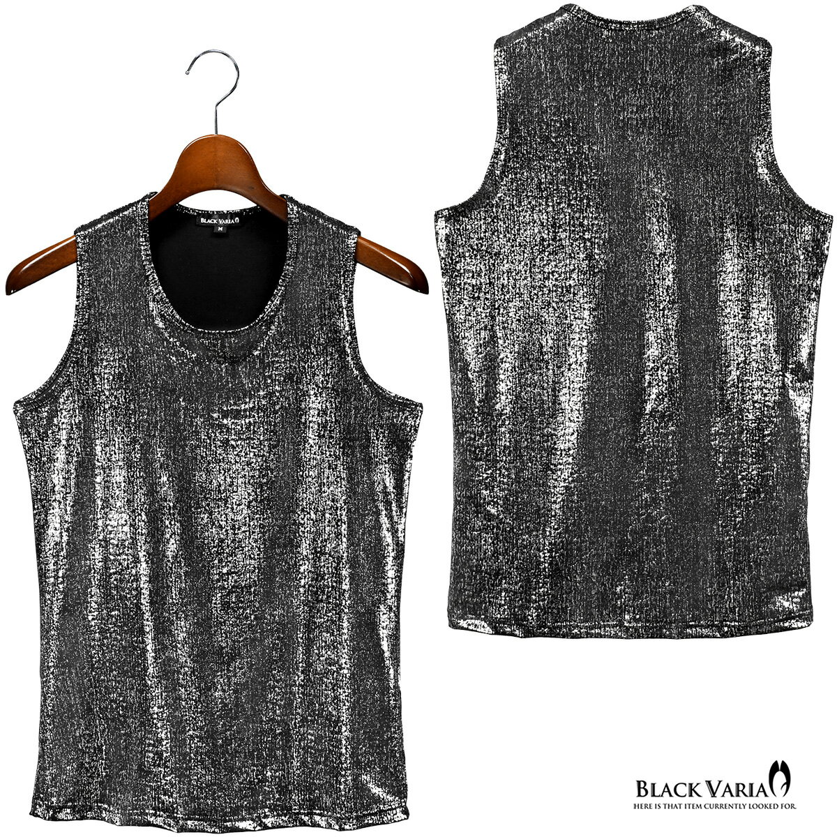タンクトップ ムラ柄 箔プリント メンズ ストレッチ 光沢 細身 タンク mens ファッション おしゃれ (ブラック黒×シルバー箔) 213700