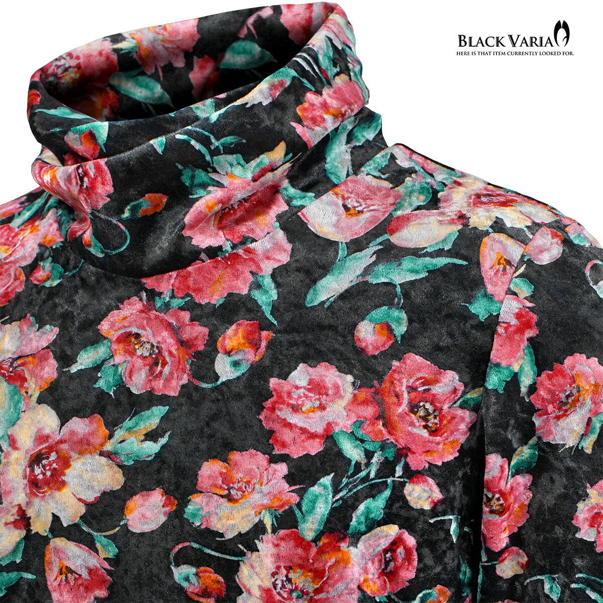 タートルネック ねじれ襟 くしゅくしゅ 花柄 ベロア 薔薇 メンズ 長袖 ストレッチ mens(ブラック黒レッド赤) 233701
