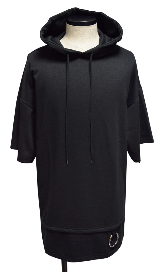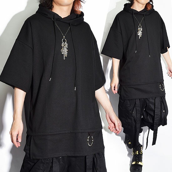 tシャツ メンズ パーカー メンズ プルオーバーパーカー フードカットソー 変形 リング 重ね着 無地 ブラック 黒 フード お兄系 V系 ビジュアル系 ホスト 大人 送料無料 春 夏 新作 30代 40代 個性的 モード系ファッション ストリート系ファッション 衣装