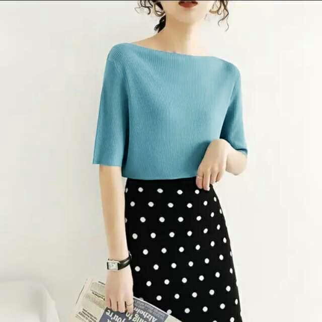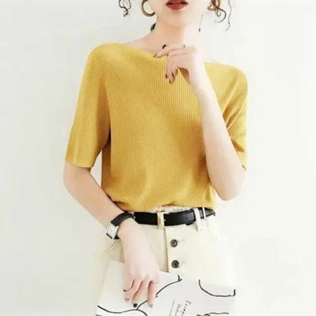 【送料無料】サマーニット アイスシルクセーター レディース トップス 無地 ボートネック アイスシルク リブニット 大人 五分袖 半袖 tシャツ ショート丈 ニットソー 着やせ トップス プルオーバー ライトニット 接触冷感 涼しい