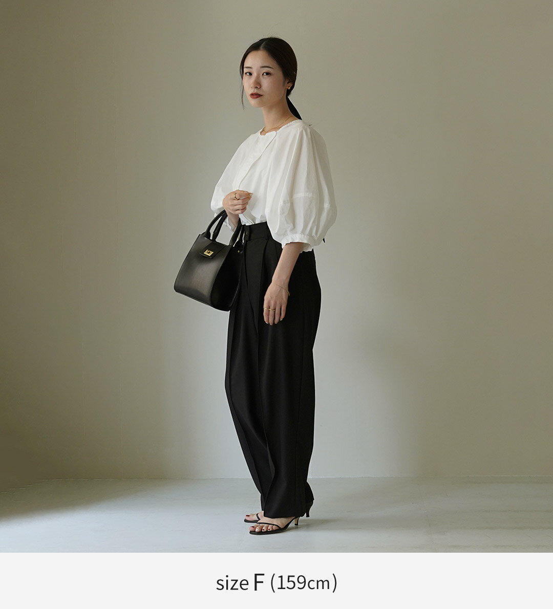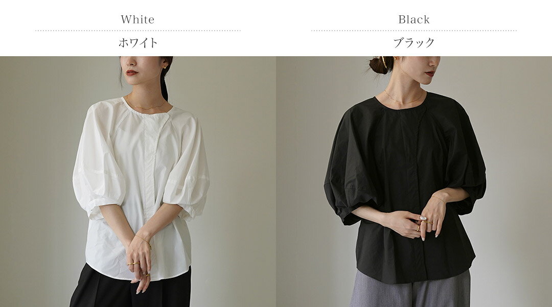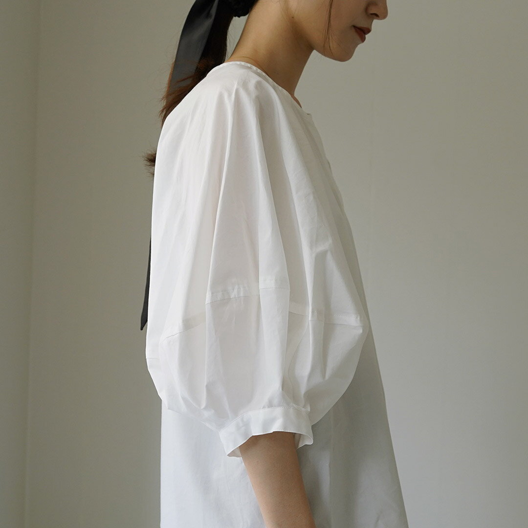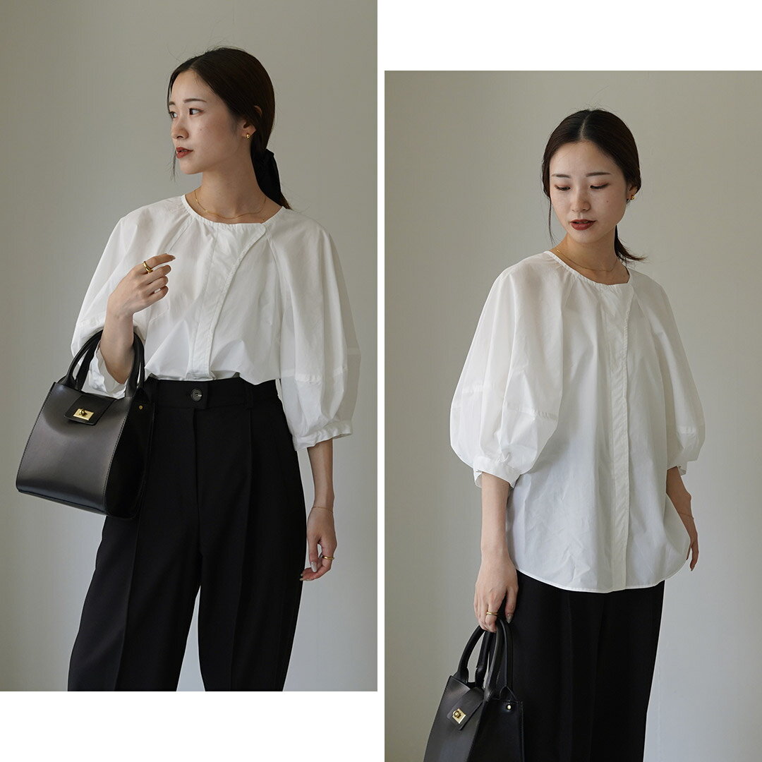 ETRE TOKYO(エトレトウキョウ) ランタンスリーブノーカラーブラウス 1224310174-0 / レディース シャツ フォーマル オフィス 白 七分袖 襟なし 綿100 日本製