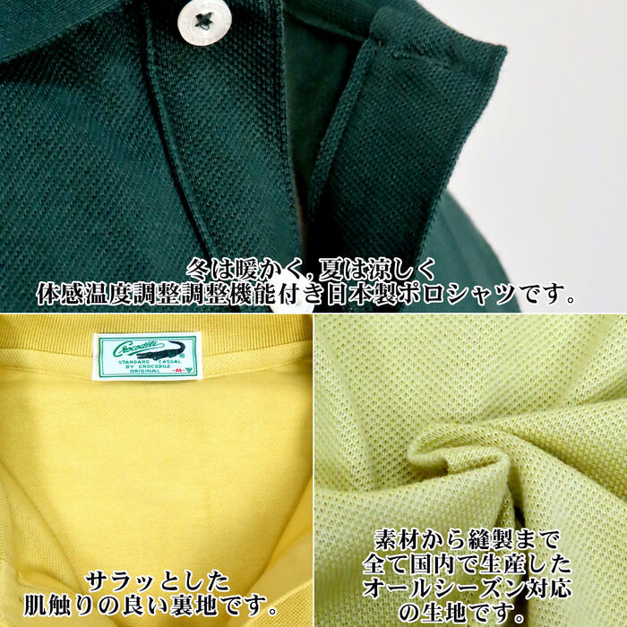 送料無料 クロコダイル 定番長袖ポロシャツ 無地 グリーン レッド イエロー 全3色 日本製 贈り物 誕生日 クリスマス 父の日 ギフト (ギフト対応可・無料でラッピング可)
