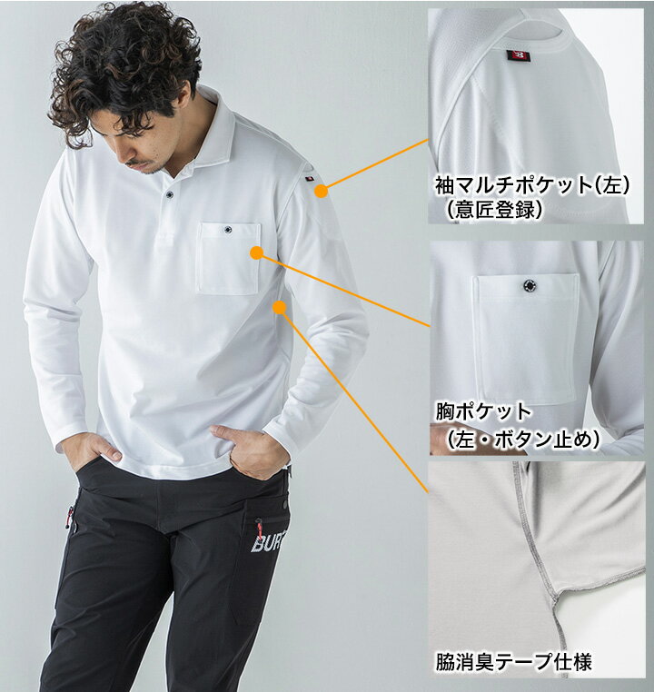 バートル ポロシャツ メンズ 長袖 吸汗速乾 消臭 ドライ 鹿の子 ストレッチ 消臭 665 メンズ レディース 消臭テープ付き 胸ポケット 左腕マルチポケット ユニフォーム サイズ SS S M L LL 3L 4L 5L 6L カラー 白 黒 ブラック 紺 コン ネイビー 青 グレー
