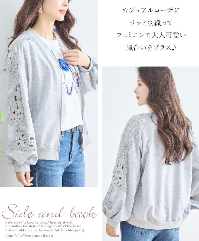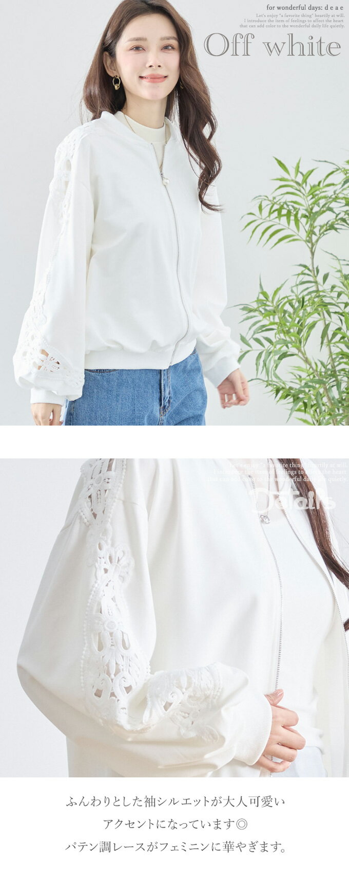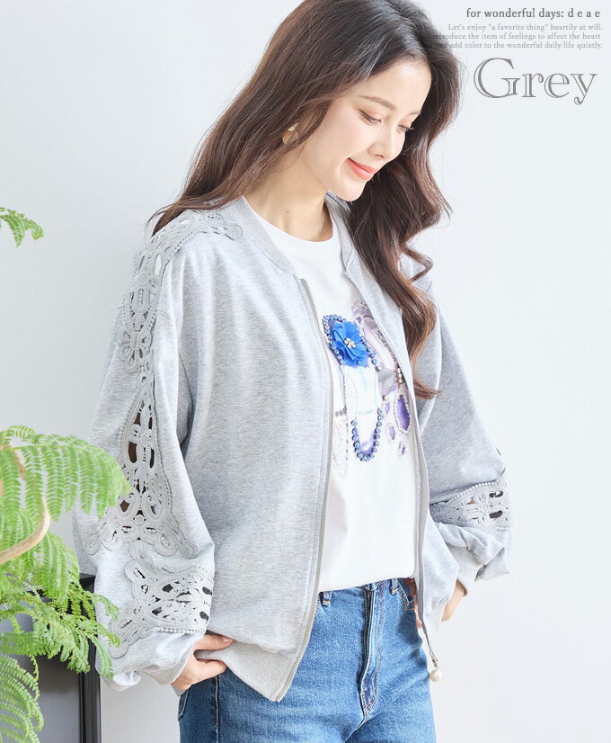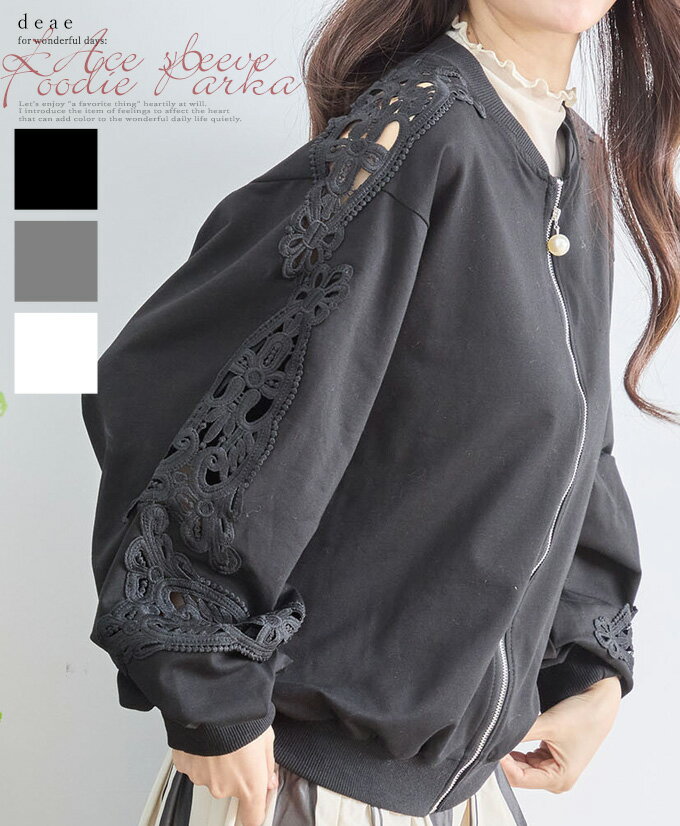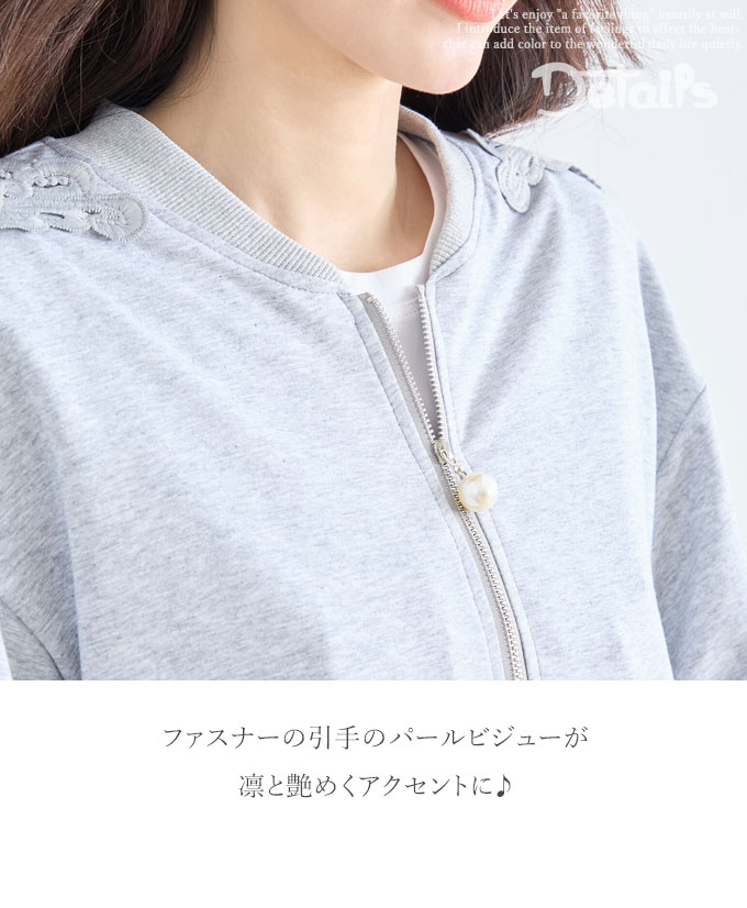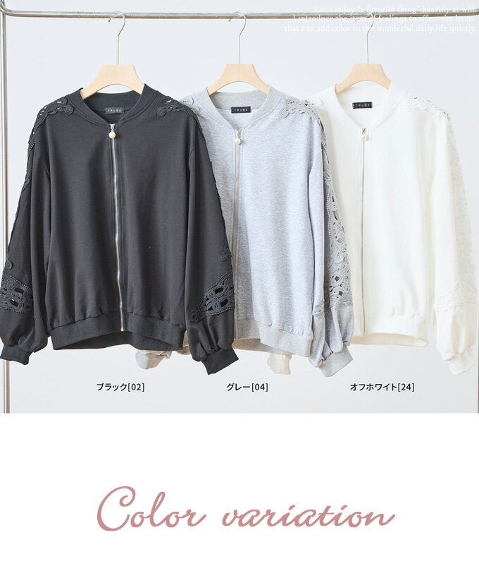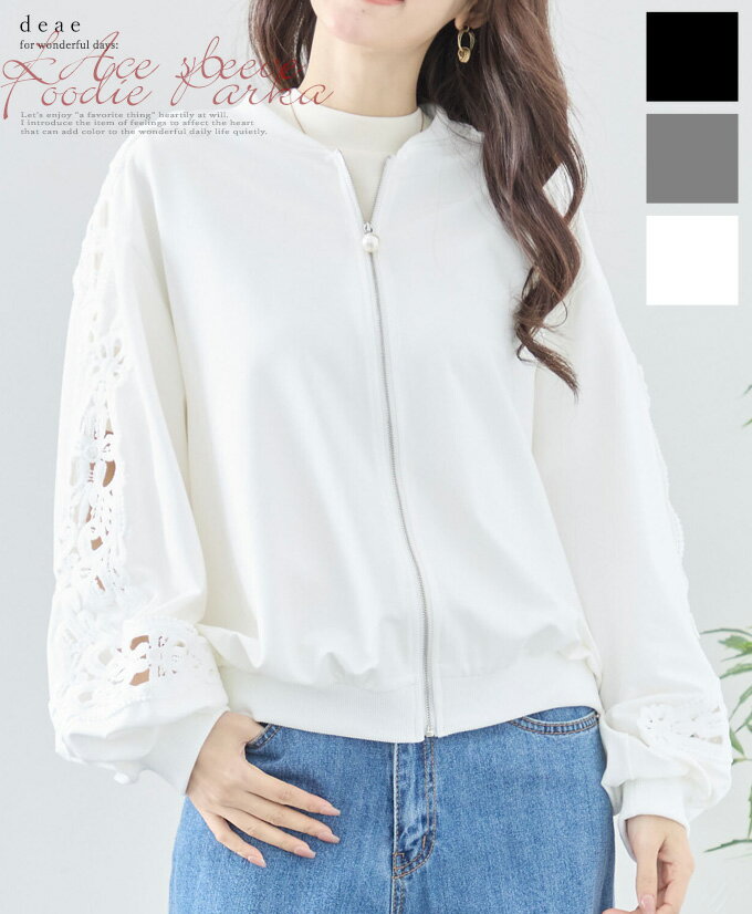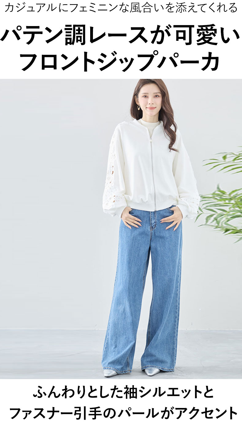 トップス 長袖 パテンレース風 ふんわり袖 フロントジップアップ フード無しパーカー 引手パールビジュー レディース 春 秋 冬 ファッション 上品 カジュアル 綺麗めフェミニン「パテン調レースがフェミニンに華やぐ フード無しパーカー」