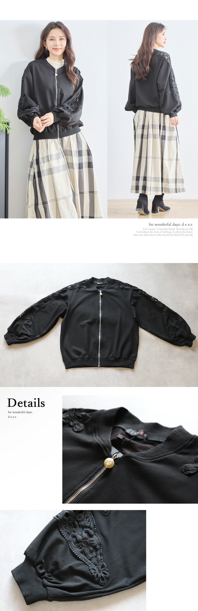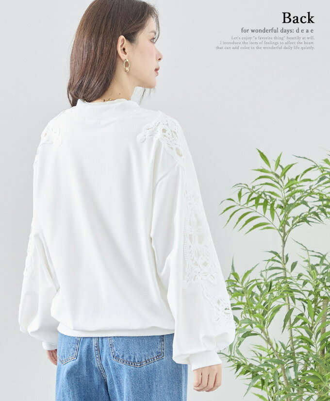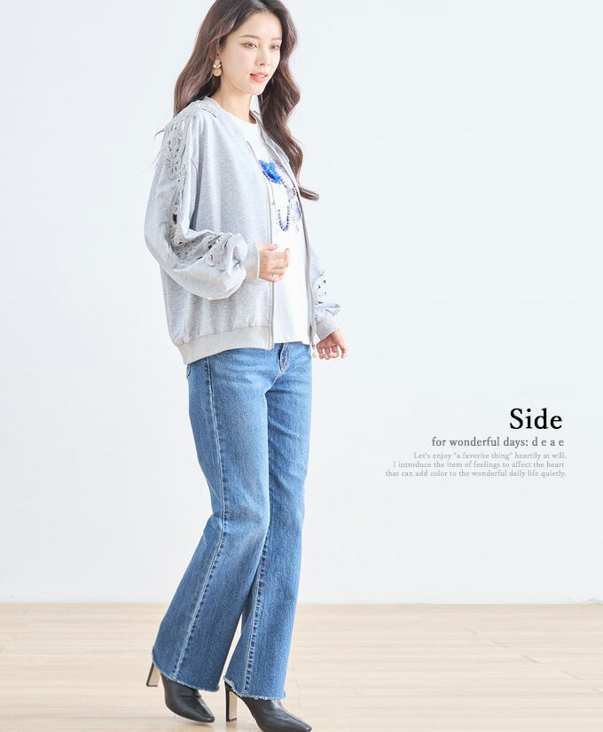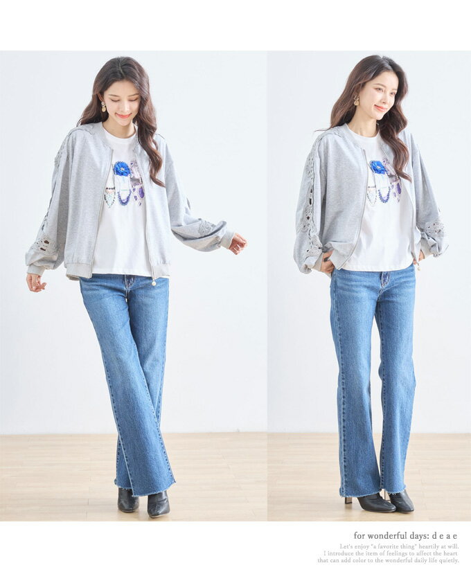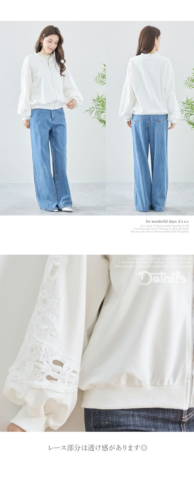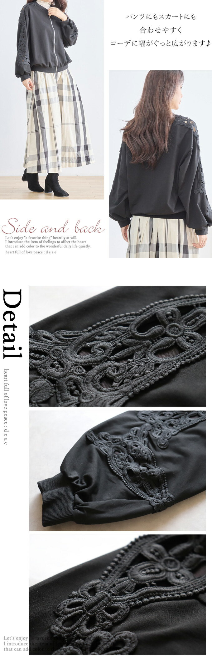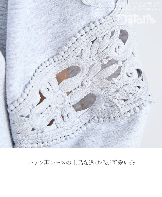 トップス 長袖 パテンレース風 ふんわり袖 フロントジップアップ フード無しパーカー 引手パールビジュー レディース 春 秋 冬 ファッション 上品 カジュアル 綺麗めフェミニン「パテン調レースがフェミニンに華やぐ フード無しパーカー」
