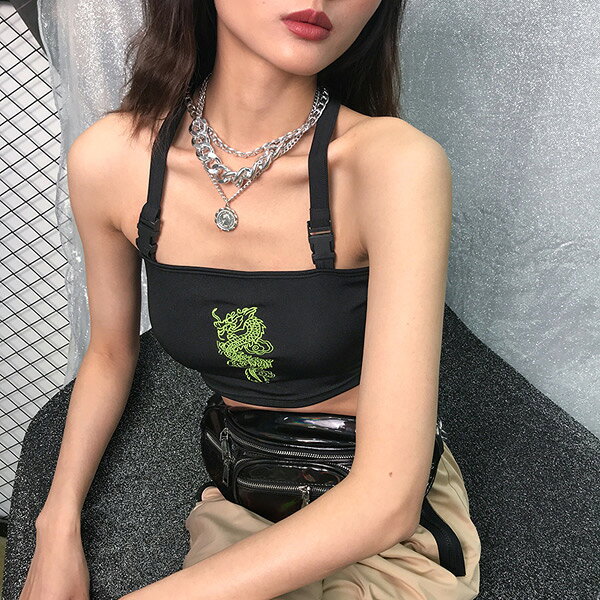 【送料無料】 キャミソール タンクトップ セクシー トップス クロップド丈 ショート丈 ドラゴン 刺繍 ビスチェ ブラック レッド ショート丈 トップス ダンス 衣装 ヒップホップ コスチューム 韓国ファッション 大きいサイズ 個性的 服