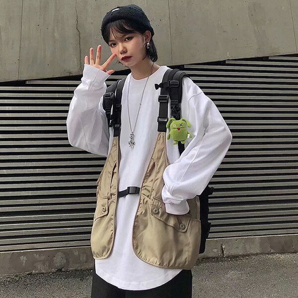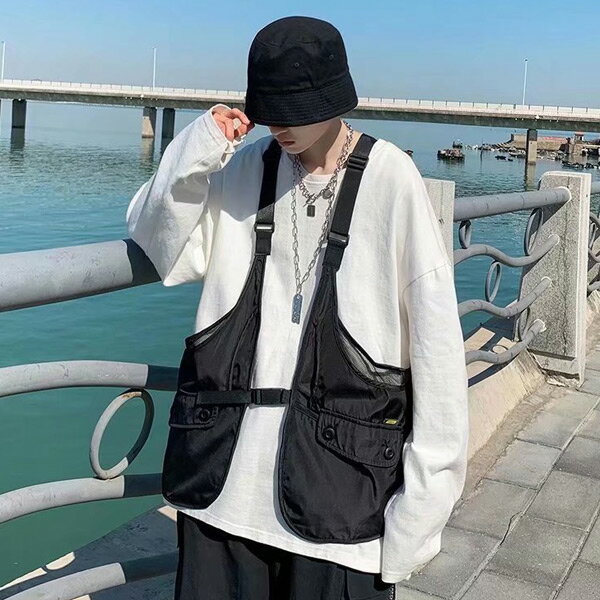 ベスト フィッシングベスト ストラップベスト カーゴベスト ジレ 黒 ベージュ ダンス 衣装 ヒップホップ コスチューム 韓国ファッション 大きいサイズ 個性的 服 トップス