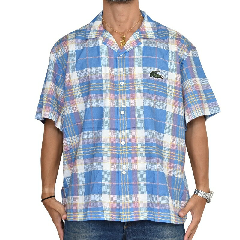 大きいサイズ メンズ ラコステ LACOSTE 半袖シャツ チェック柄 ワンポイント バックプリント Short Sleeve Organic Cotton Check Shirt 45 XXL