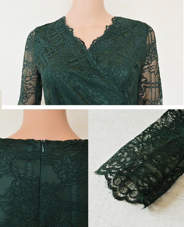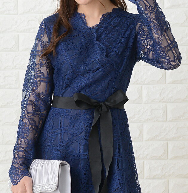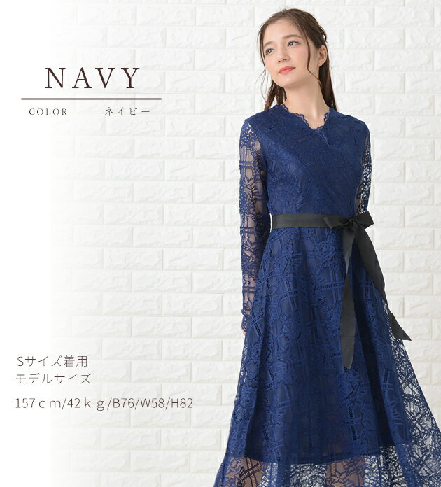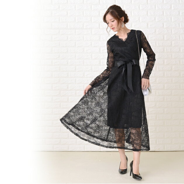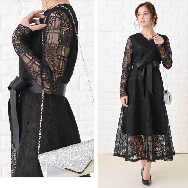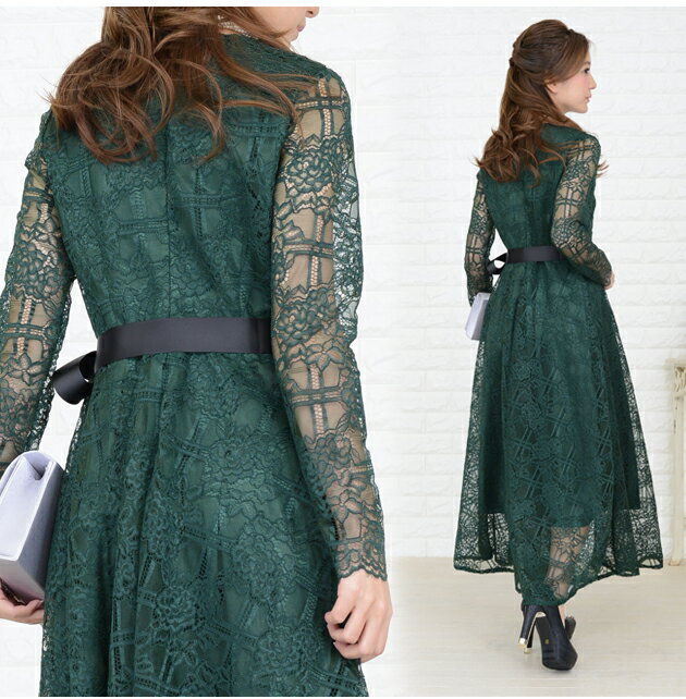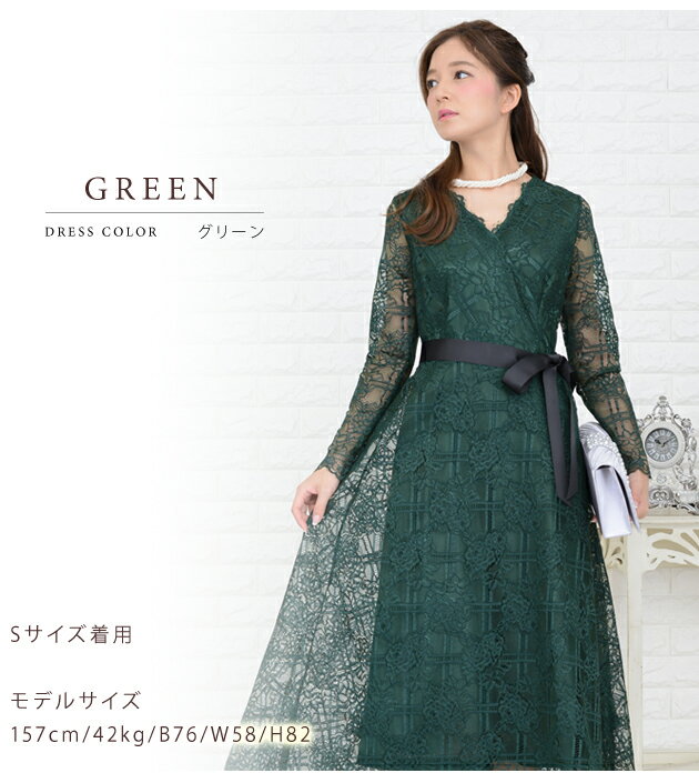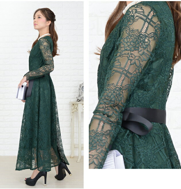 総レース ワンピース ロングドレス パーティードレス レースワンピ ドレスワンピース Aライン レディース 長袖 リボン 結婚式 二次会 演奏会 ウエストリボン パーティー ミモレ丈 ディナーデート 大きいサイズ グリーン 春 夏 秋 冬 お呼ばれ ブラック 黒