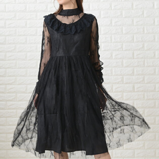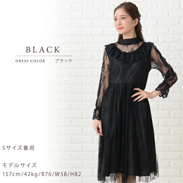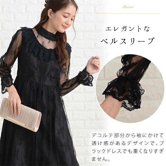 パーティードレス ミモレ丈 レース ワンピース ブラック 結婚式 二次会 演奏会 長袖 ベルスリーブ 膝下丈 ミディ丈 ドレス フレア レディース 袖あり 袖付き 大きいサイズ 大人 黒 ママ ハイネック 20代 30代 40代 春 夏 秋 冬 ネイビー