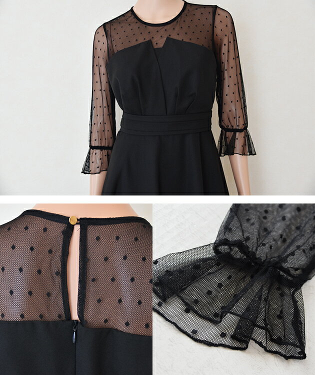 パーティードレス ドット柄レース 水玉レース ビスチェ 後ろリボン フォーマル ワンピース ドレス 七分袖 膝丈 レディース 結婚式 二次会 お呼ばれ Aライン フレア フォーマル 膝丈 春 夏 秋 冬 黒色 ブラック 紺色 ネイビー 他と被らない