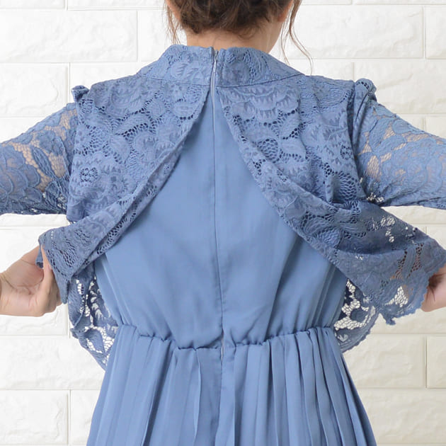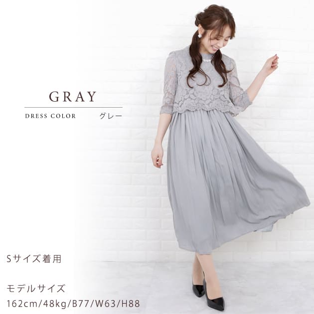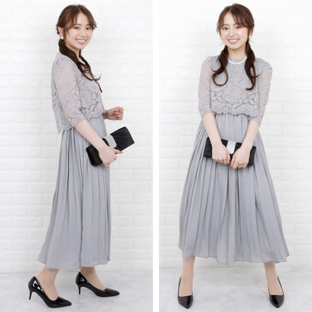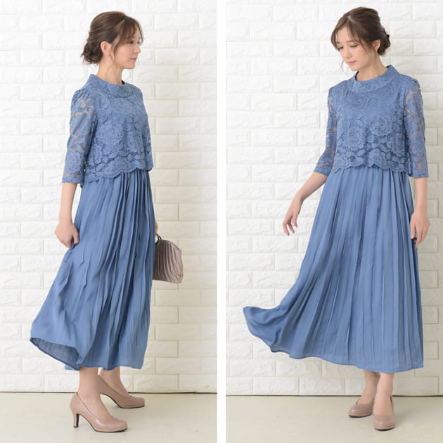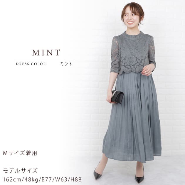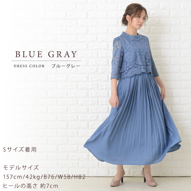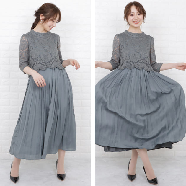 花柄レース プリーツ ロングドレス ブラック ネイビー ブルーグレー ミント グレー 結婚式 披露宴 二次会 お呼ばれ 演奏会 フォーマル パーティ ゆったり 大きいサイズ レース袖 七分袖 袖あり 黒 紺 Aライン シフォン 20代 30代 40代