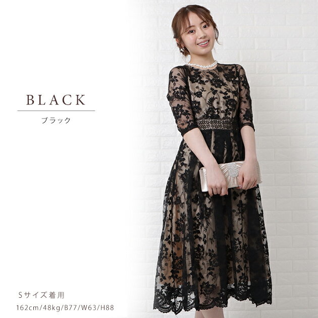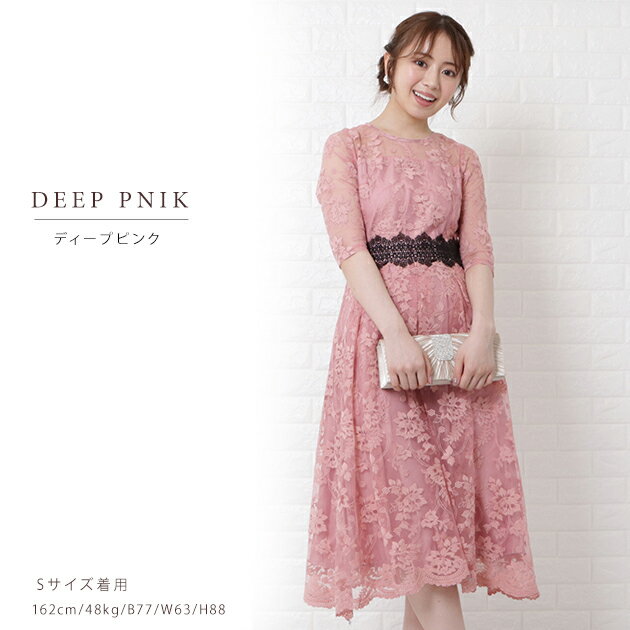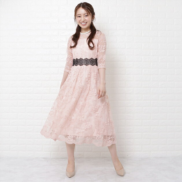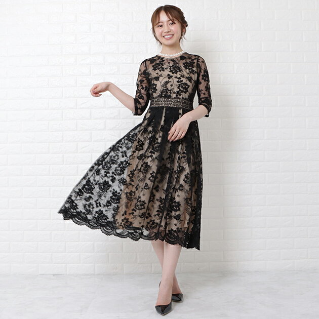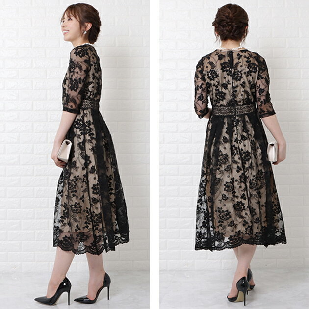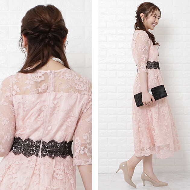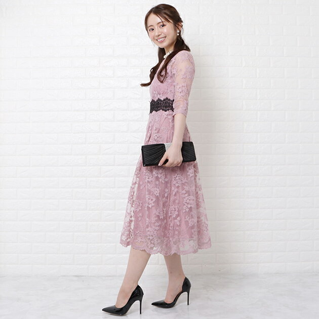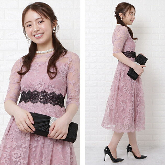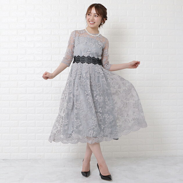 パーティードレス 総レース ワンピース シースルー袖 フレア Aライン ウエストマーク ミモレ丈 ロング丈 五分袖 袖あり 袖付き 春 夏 秋 冬 結婚式 披露宴 七五三 入学式 謝恩会 お呼ばれ オケージョン フォーマル レディース ラベンダー ピンク ブラック グレー
