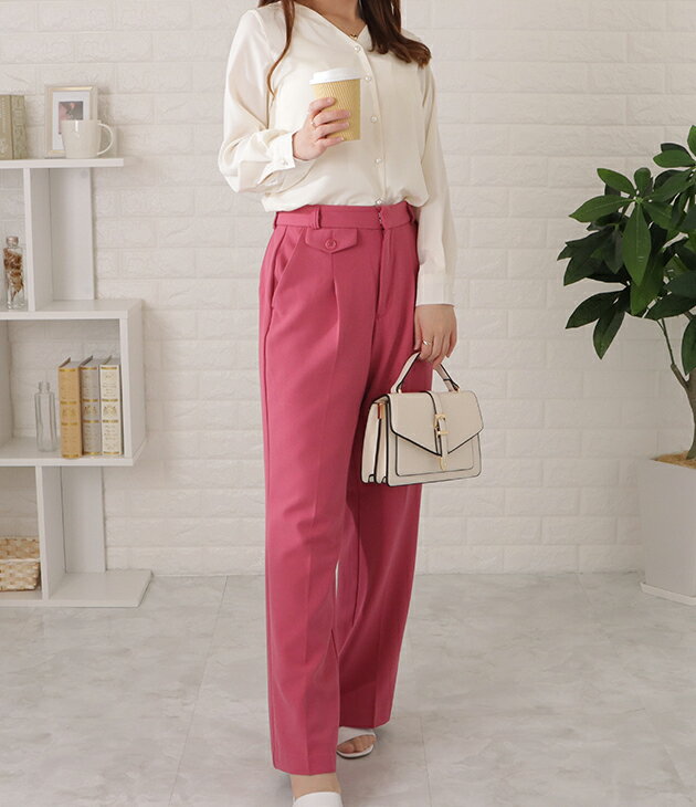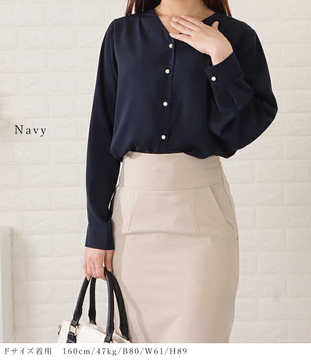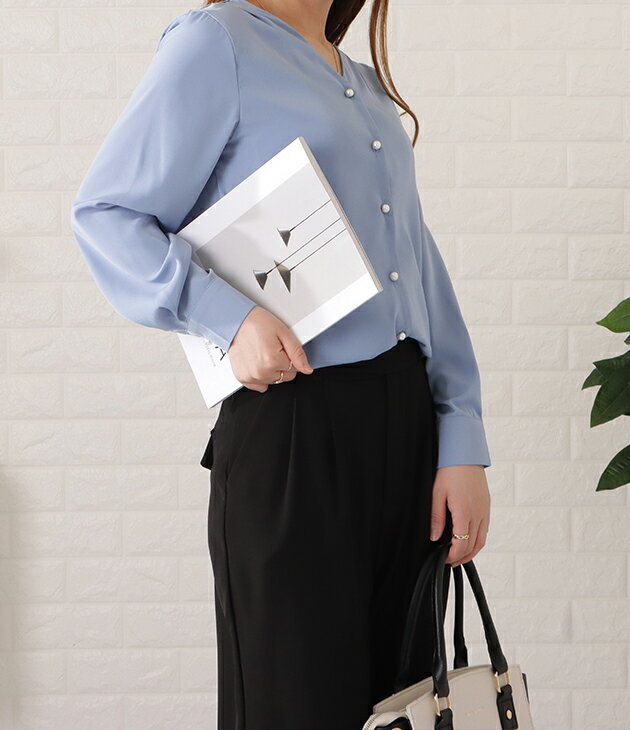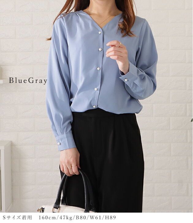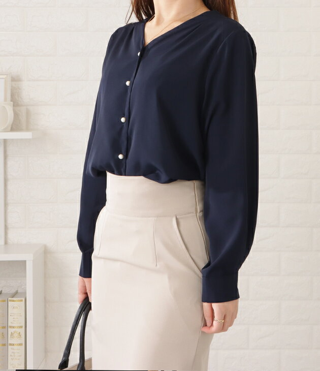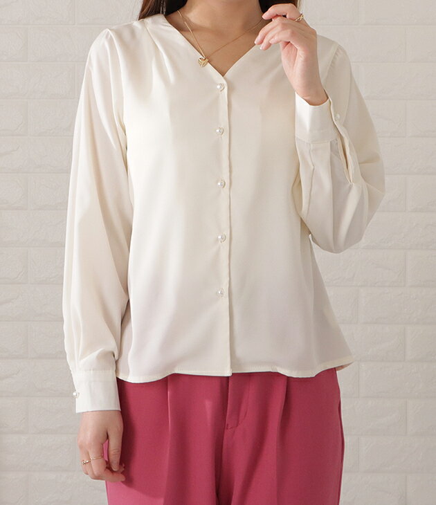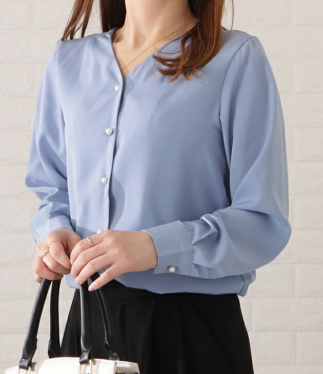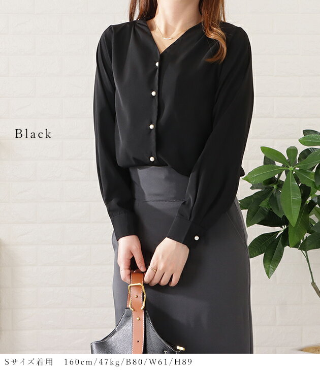 パールボタンVネックとろみブラウス 女性 レディース トップス クラシカル 上品 レディライク フェミニン 女性らしい オフィス カジュアル ジャケット シンプル 無地 ベーシック インナー ブラック アイボリー ブルーグレー ネイビー