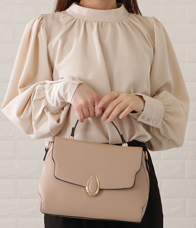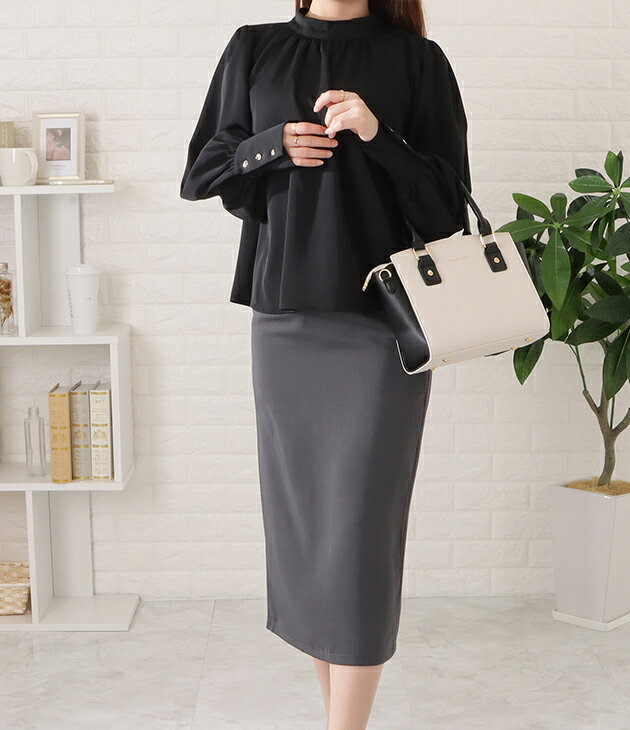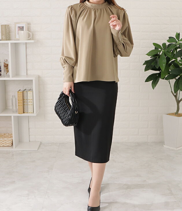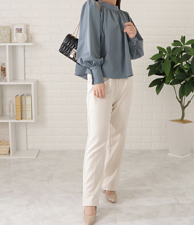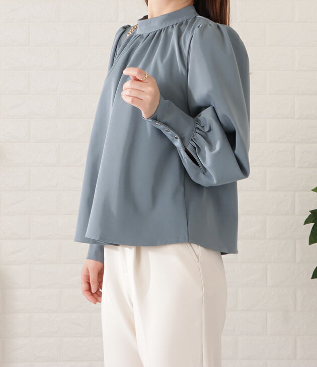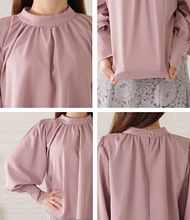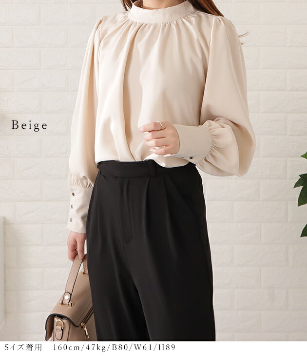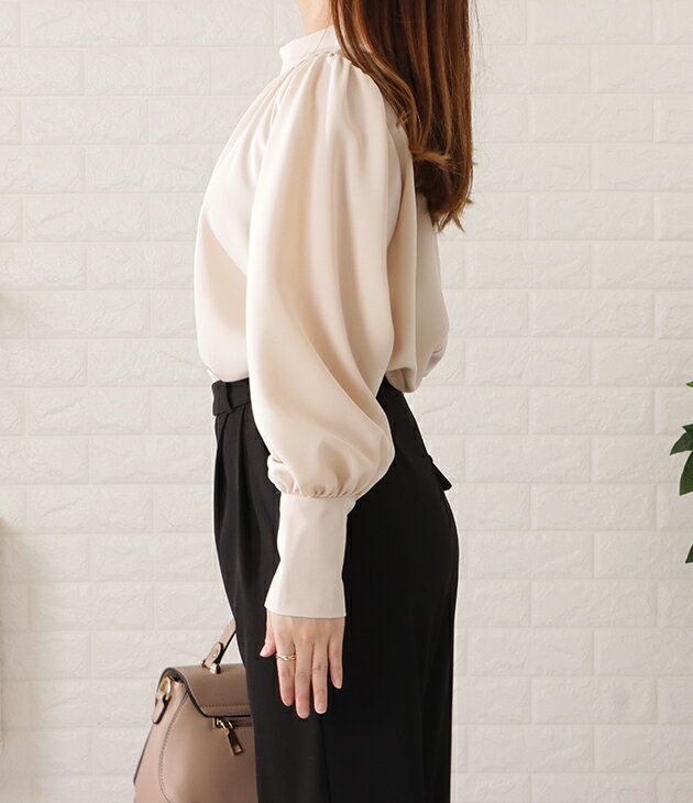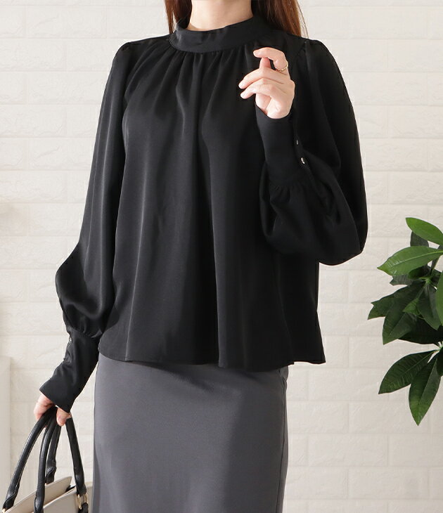 ロングカフスギャザーブラウス レディース トップス 長袖 シャツ プルオーバー プチハイネック クラシカル 上品 ギャザー バルーンスリーブ 華やか レディライク クラス感 ワンカラー シンプル オフィス セレモニー オンコーデ