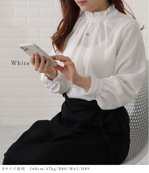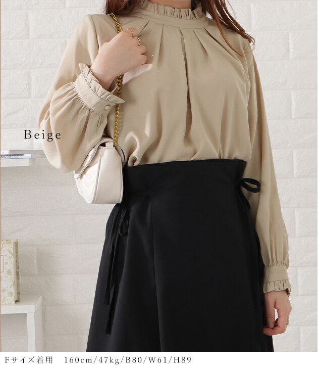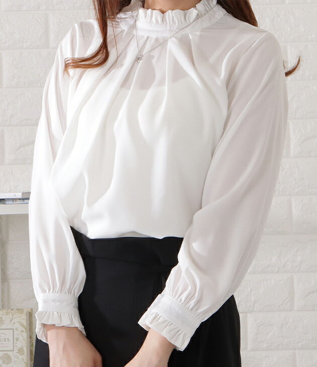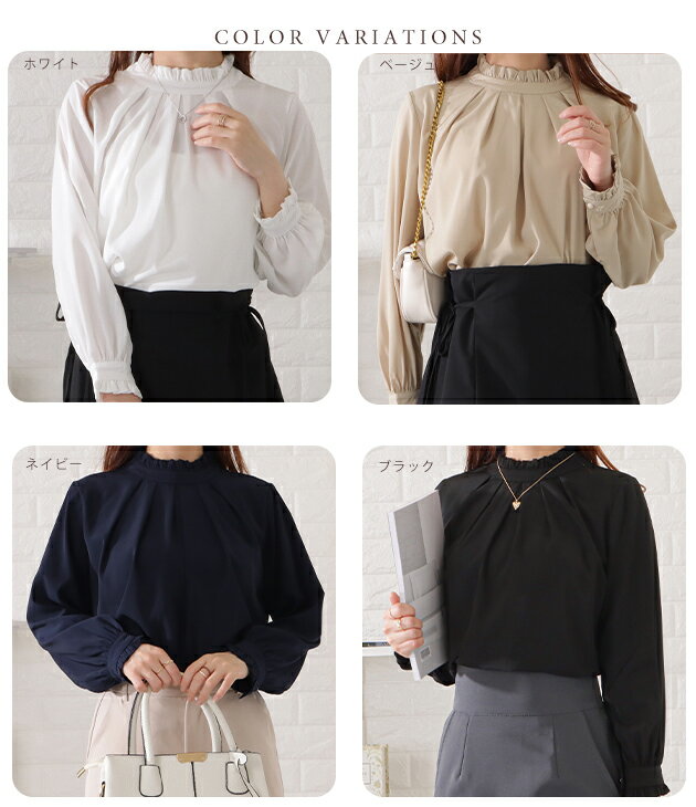 プチハイネックキャンディスリーブ長袖ブラウス 女性 レディース トップス プルオーバー ぽわん袖 シフォン ふっくら バルーン ギャザー フリル 立体感 クラシカル 上品 フェミニン カジュアル シンプル 無地 ブラック ホワイト ベージュ ネイビー