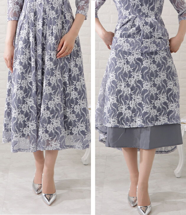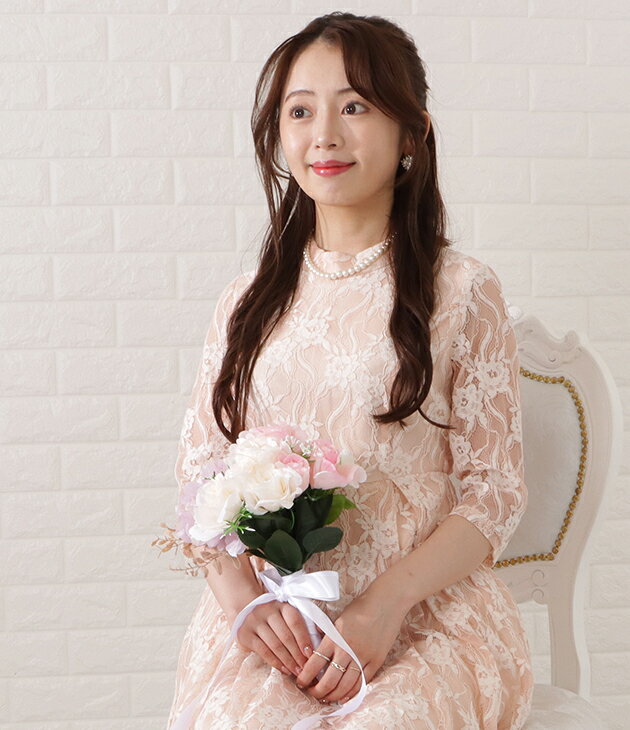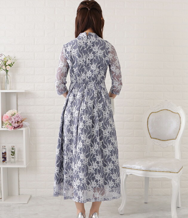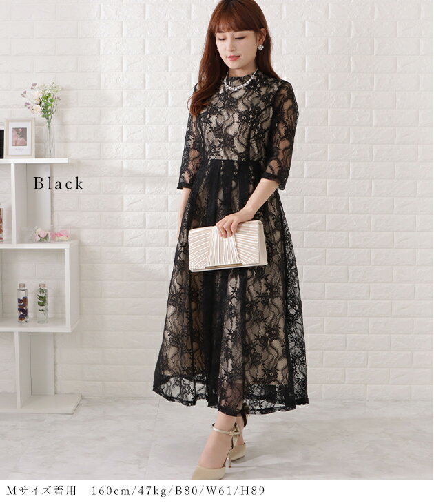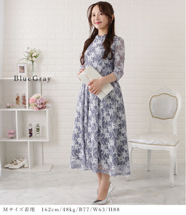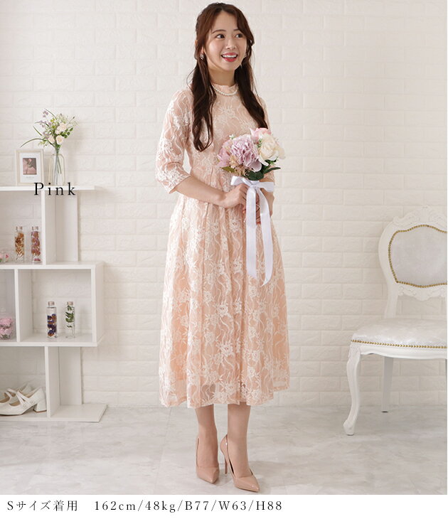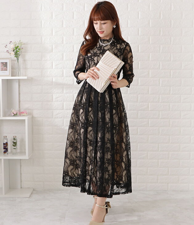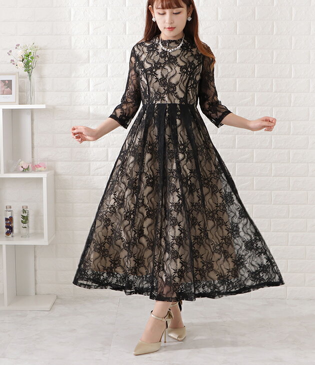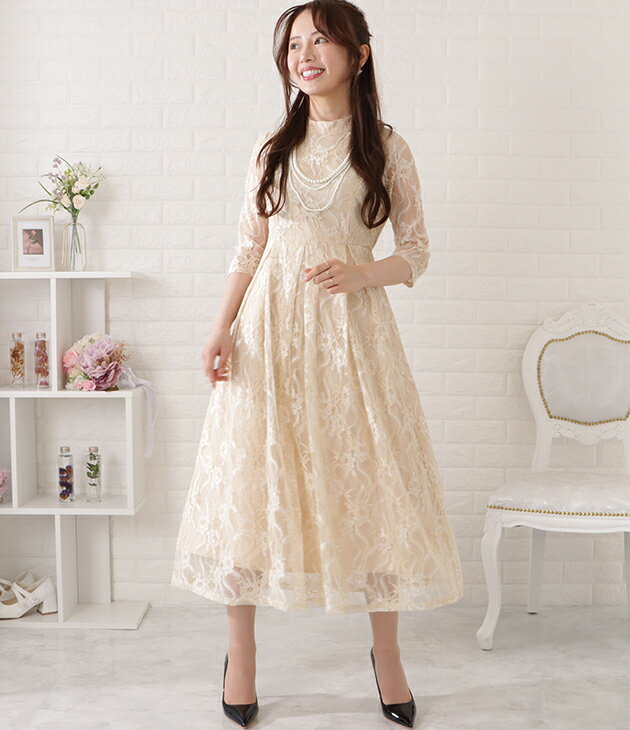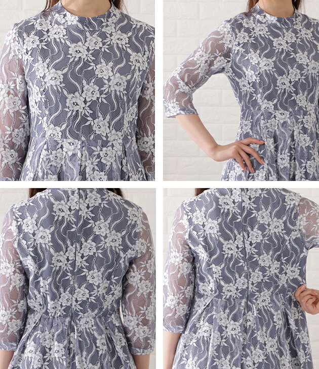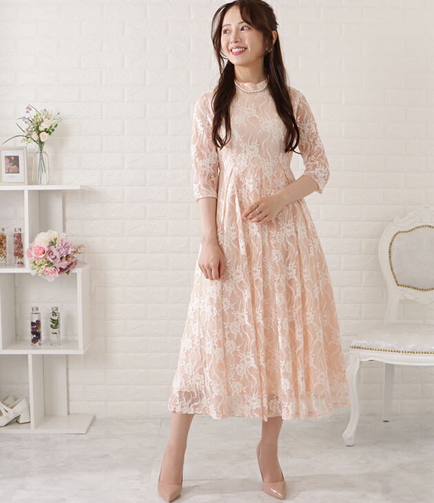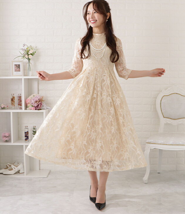 総レース5分袖タックワンピース 女性 レディース ワンピース スタンドカラー プチハイネック タック 花柄 透け感 春 夏 秋 冬 長袖 フレア フォーマル 華やか フェミニン エレガント 上品 甘め パーティー 結婚式 二次会 お呼ばれ