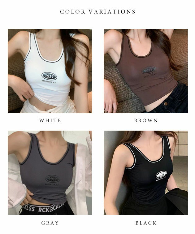 配色ライン アルファベット ロゴ カップ付き タンクトップ 女性 レディース インナー 肌着 下着 春 夏 ブラジャー ノースリーブ ハーフトップ 単色 無地 シンプル クロップド ショート ミニマル カジュアル アクティブ ストリート 肌見せ ヘルシー