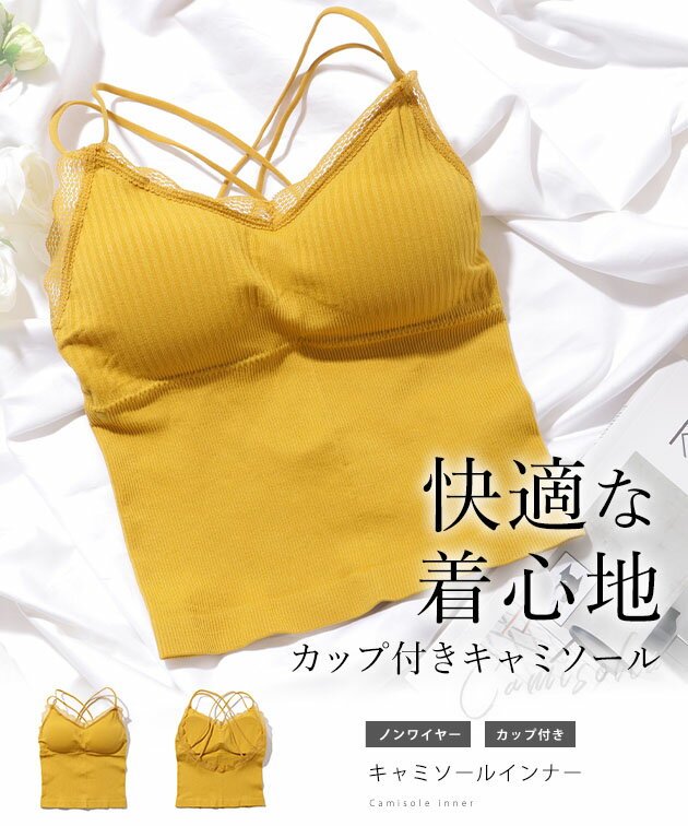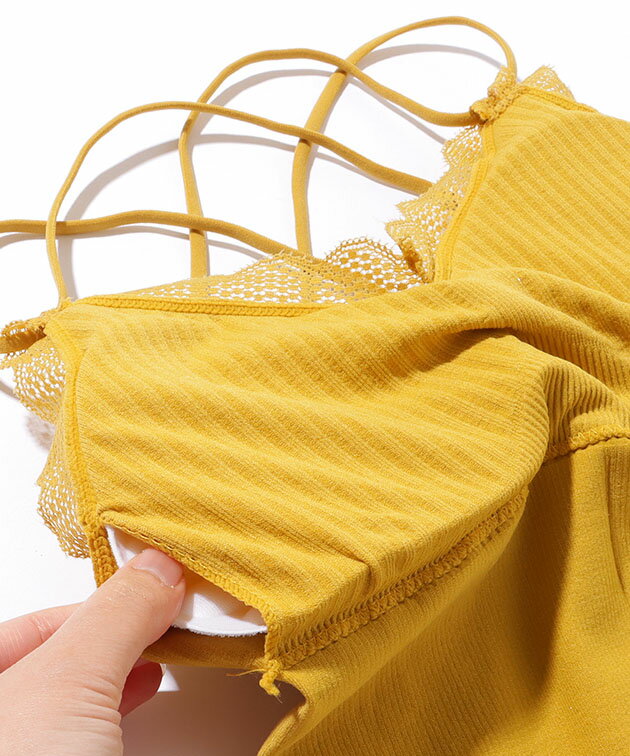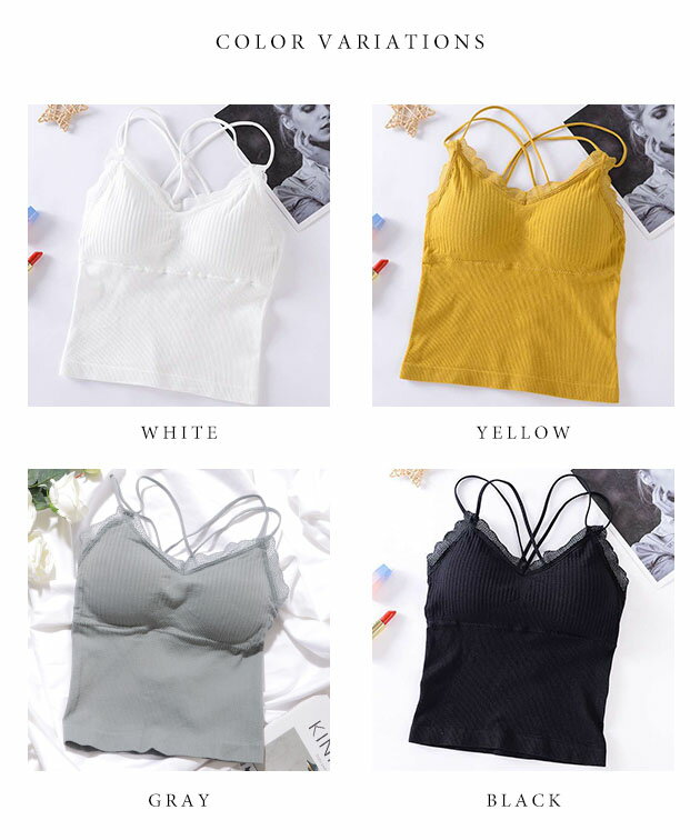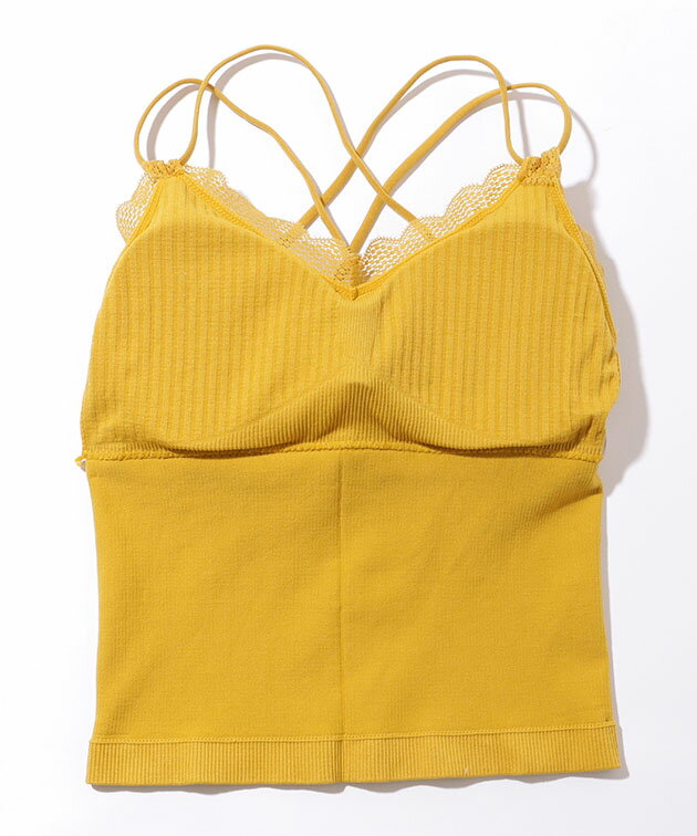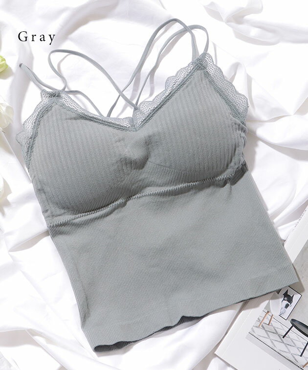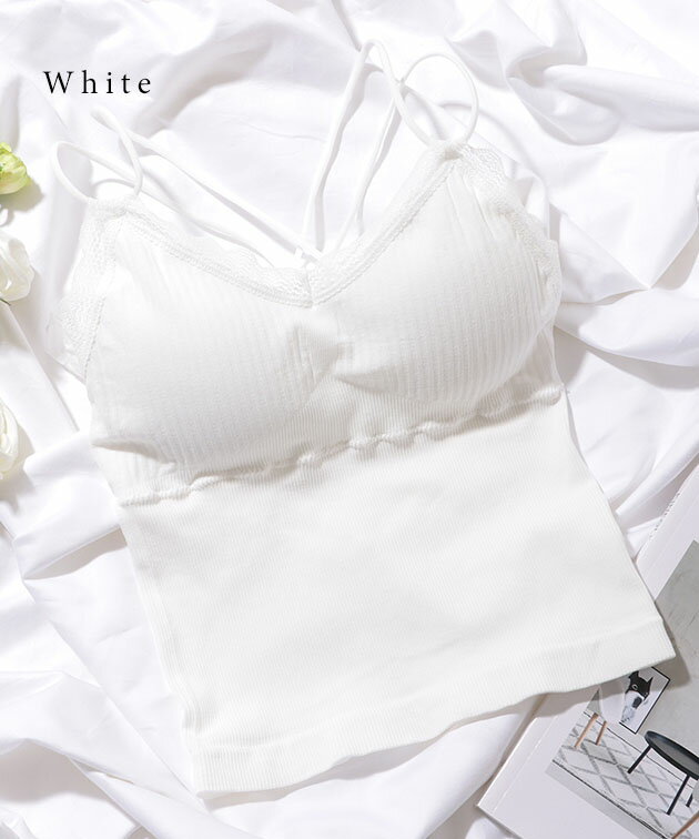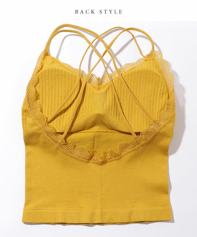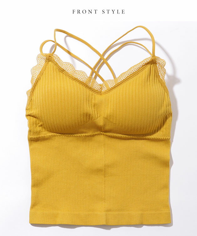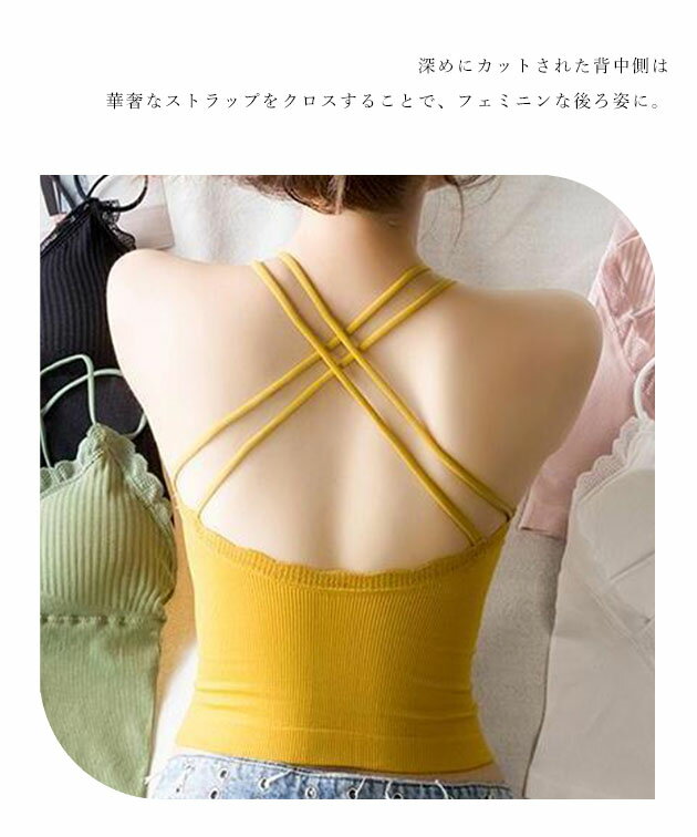レーススカラップ バック クロスストラップ カップ付き キャミソール 女性 レディース インナー 肌着 下着 春 夏 秋 冬 ブラジャー トップス カジュアル 単色 無地 リブ 伸縮 ストレッチ フィット感 Vネック フェミニン 可愛い キュート