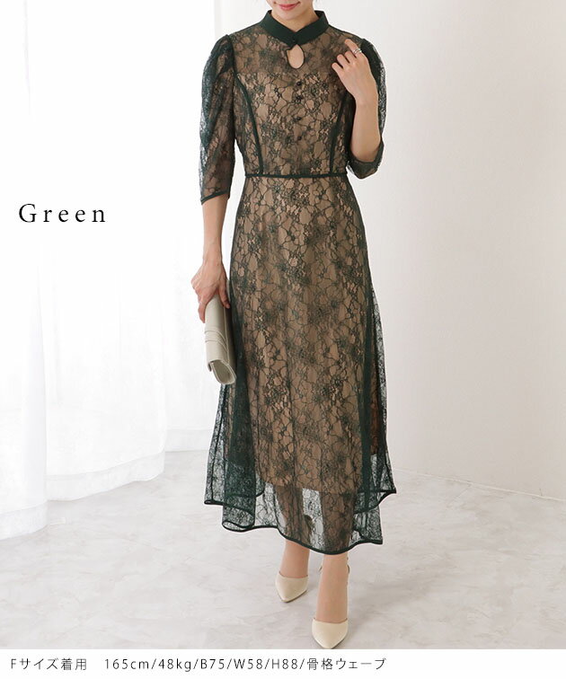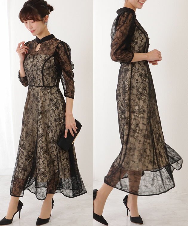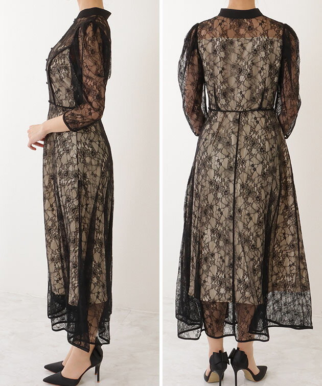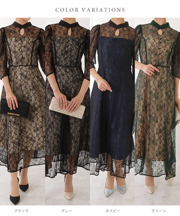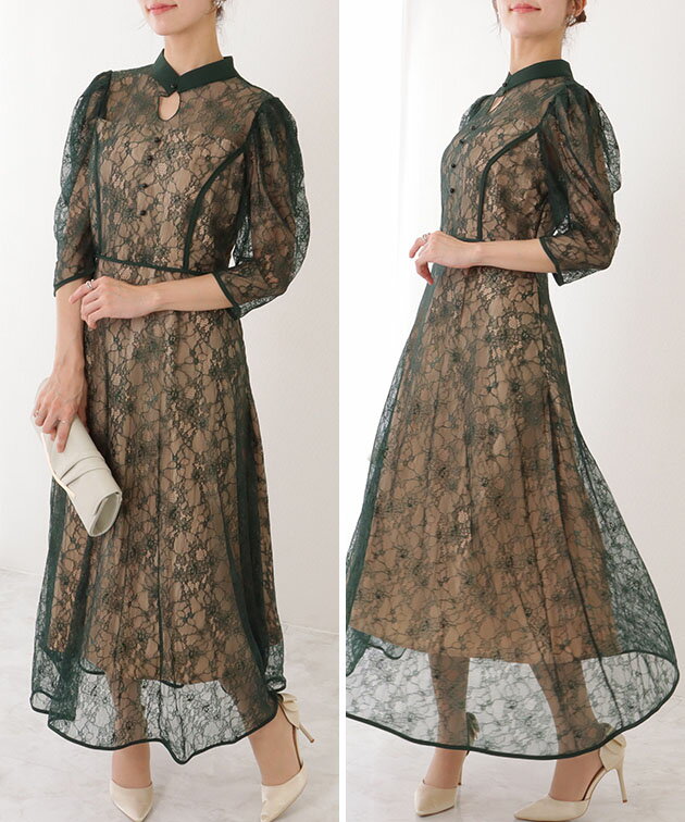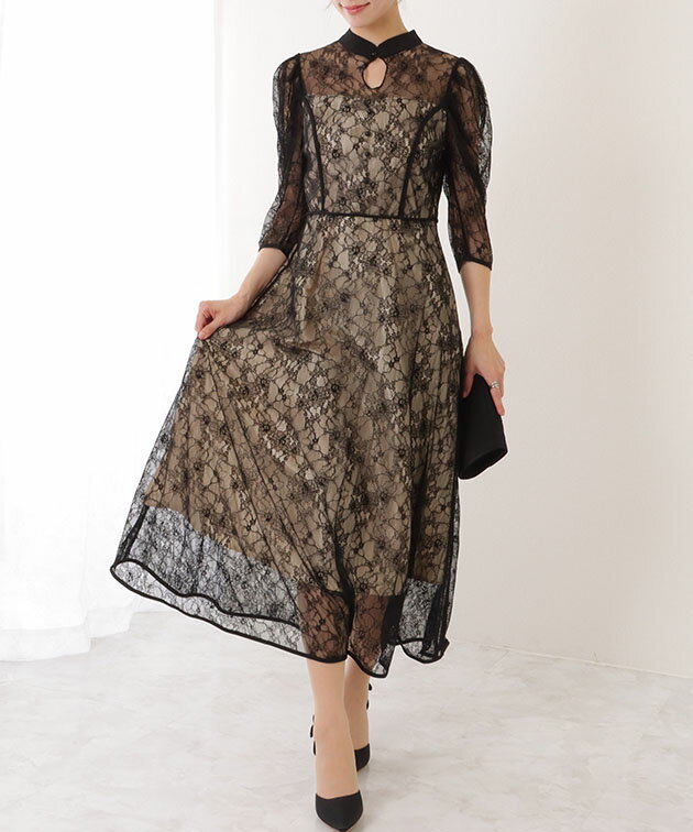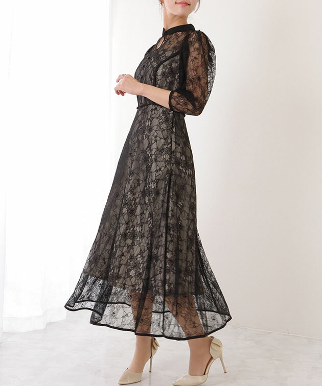 7分袖 総レース 花柄 プチハイネック ワンピース 女性 レディース フラワー ドレス スカート 結婚式 ウエディング パーティー セレモニー シアー 透け感 フェミニン フラワー クラシカル 上品 華やか エレガント ギャザー ミディ丈 ロング