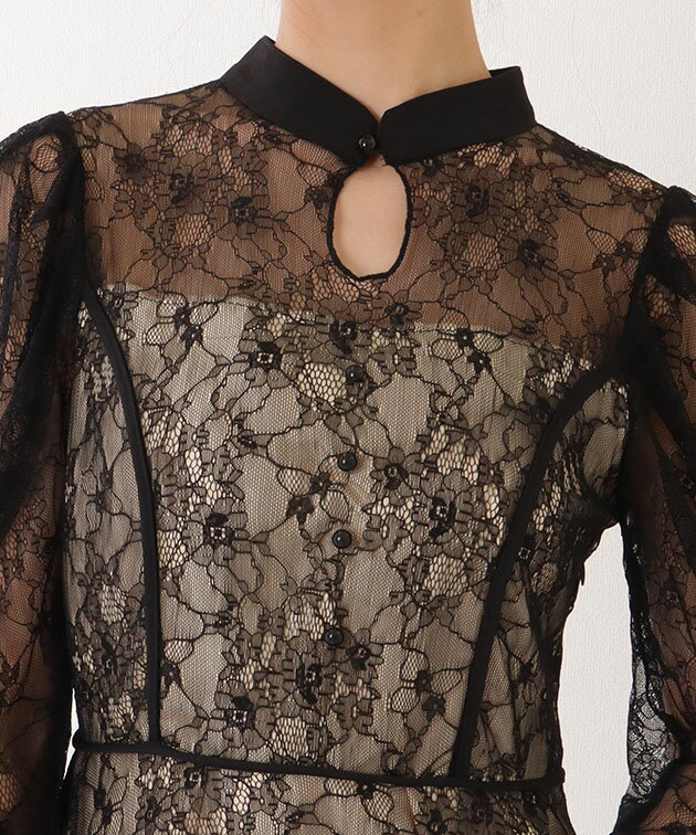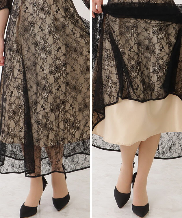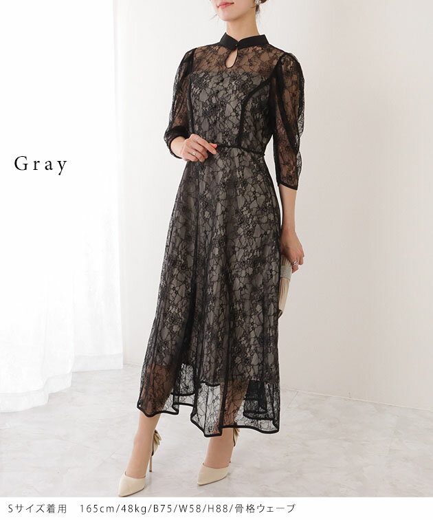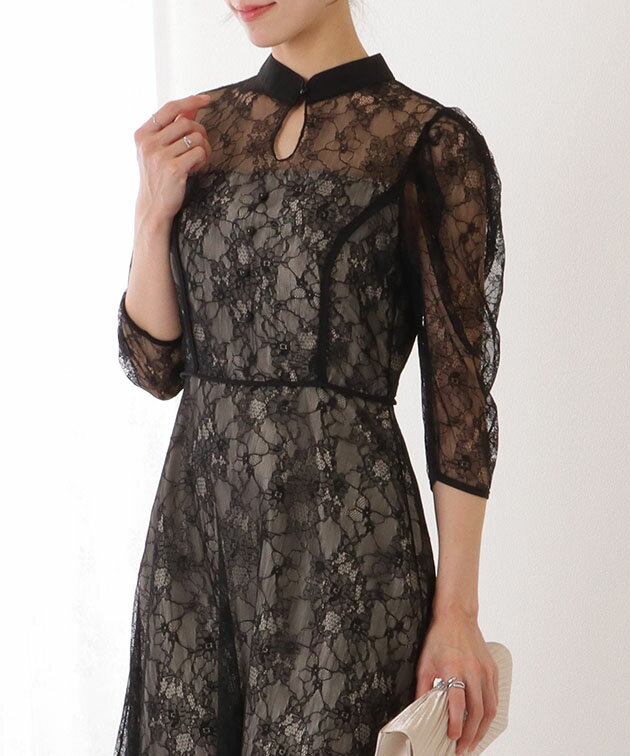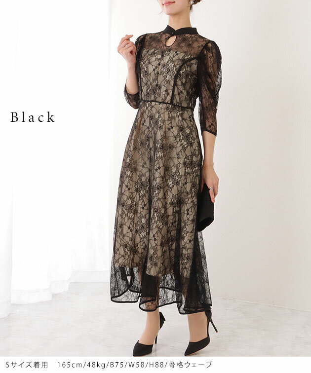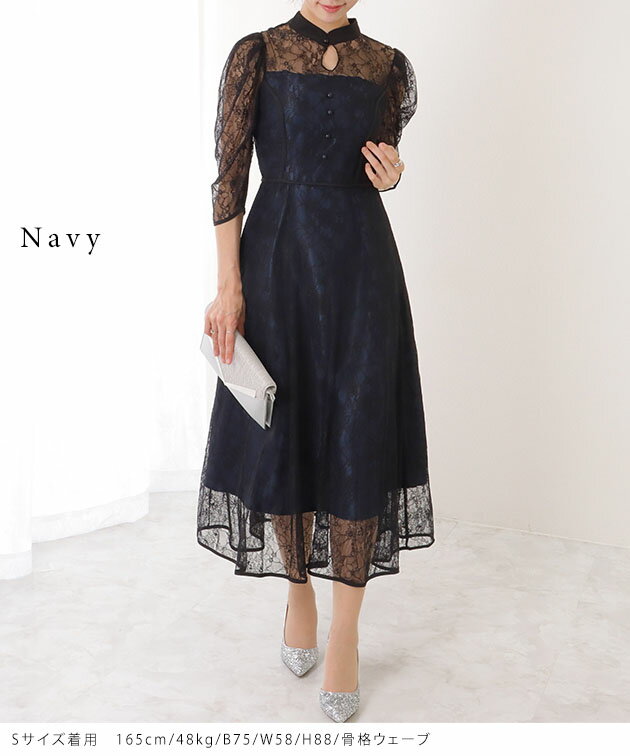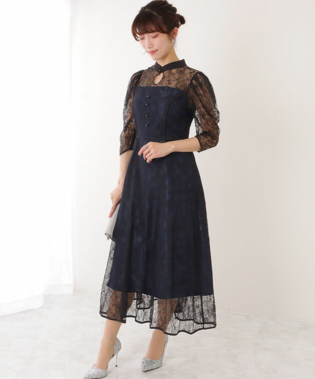7分袖 総レース 花柄 プチハイネック ワンピース 女性 レディース フラワー ドレス スカート 結婚式 ウエディング パーティー セレモニー シアー 透け感 フェミニン フラワー クラシカル 上品 華やか エレガント ギャザー ミディ丈 ロング