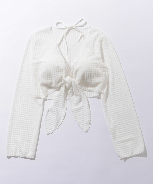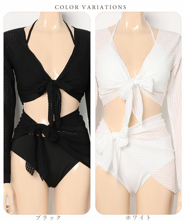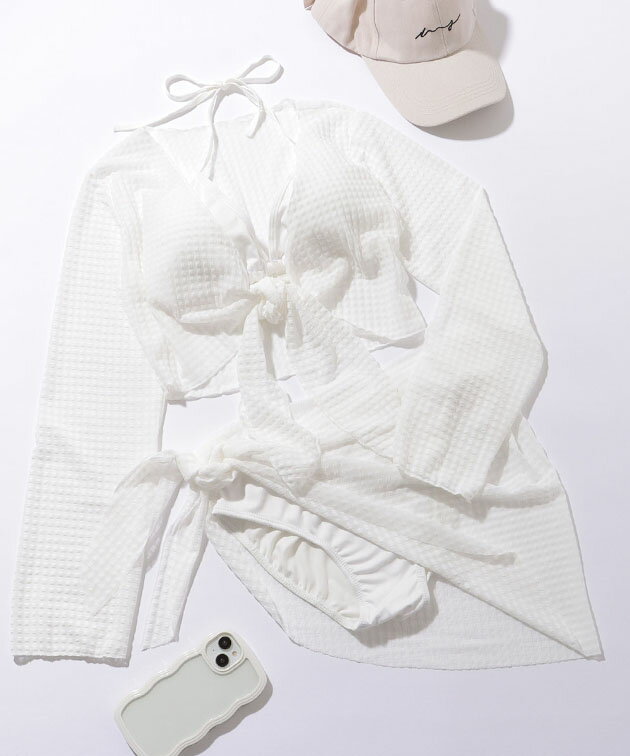 【4点セット】 カーディガン パレオ付き ぽこぽこ 長袖 Vネック ホルター ビキニ 女性 レディース スイムウエア ラッシュガード 夏 海 プール 単色 無地 長袖 リボン パレオ 体型カバー 細見え 華奢見え フェミニン セクシー