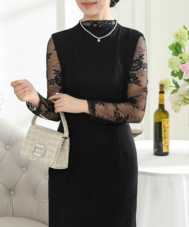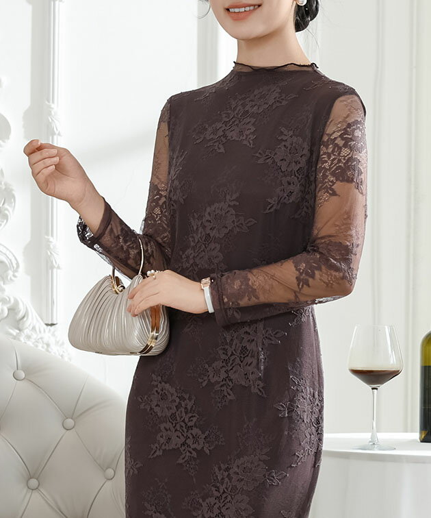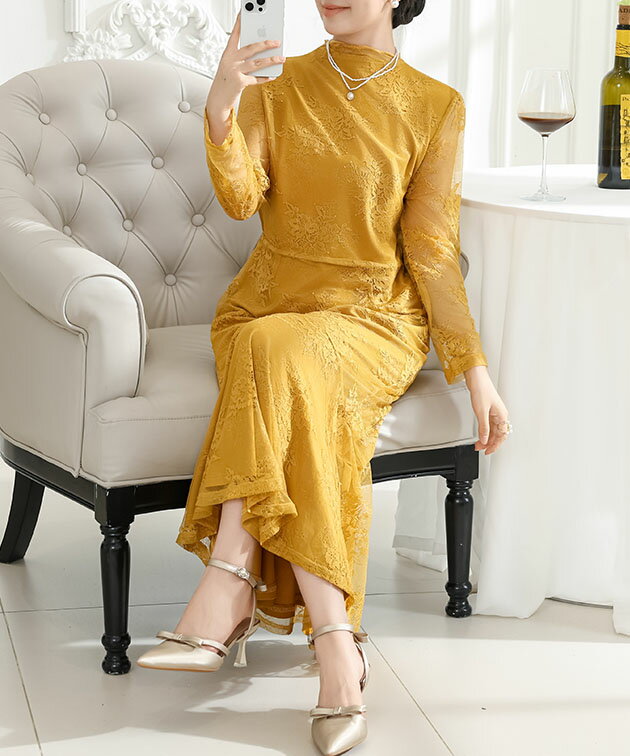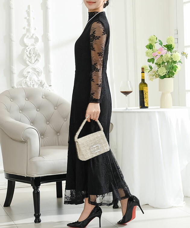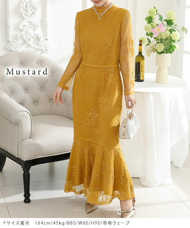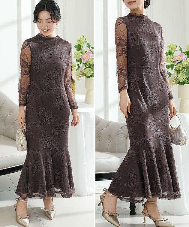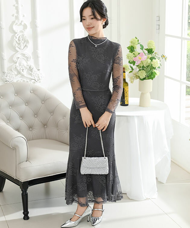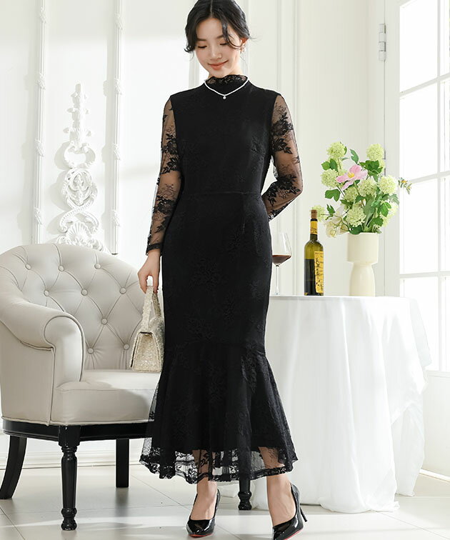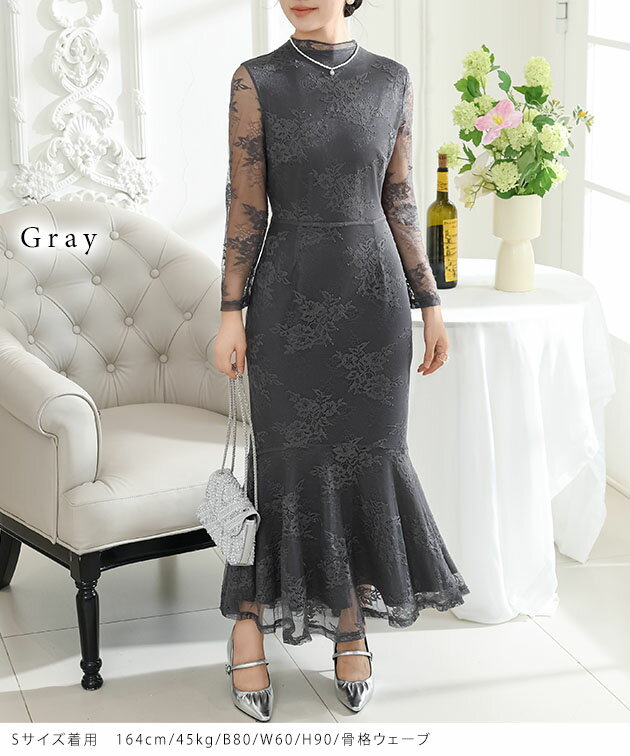 フラワー 総レース マーメイド ドレス ワンピース 女性 レディース スカート ロング マキシ 春 夏 秋 冬 長袖 花 ロマンチック フレア メロウ 切り替え シアー 透け感 華やか フェミニン セクシー 大人 上品 オケージョン 結婚式 謝恩会