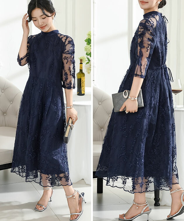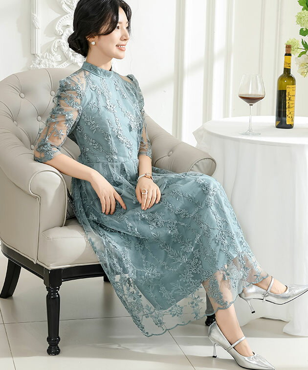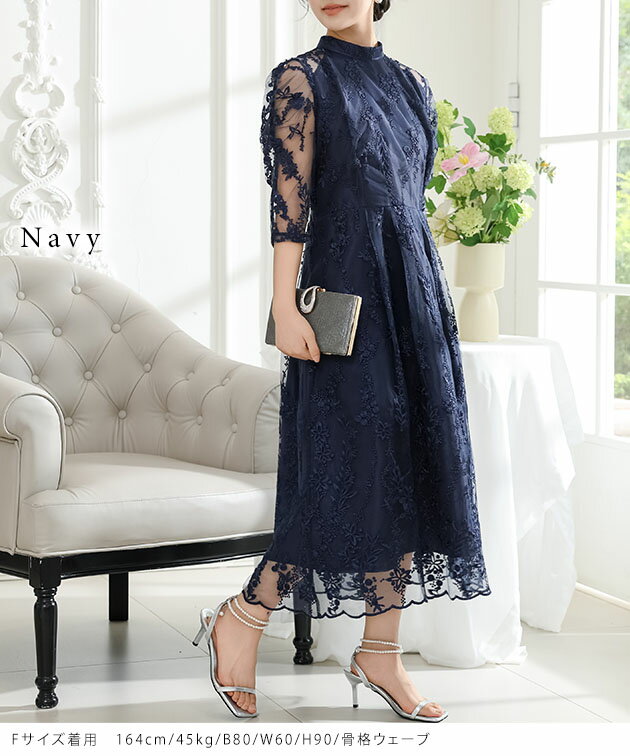 総レース プチハイネック スカラップ フレア ワンピース 女性 レディース ドレス 半袖 春 夏 秋 冬 花 フラワー ボタニカル エレガント タック Aライン ミディ丈 ミモレ丈 結婚式 パーティー オケージョン 華やか
