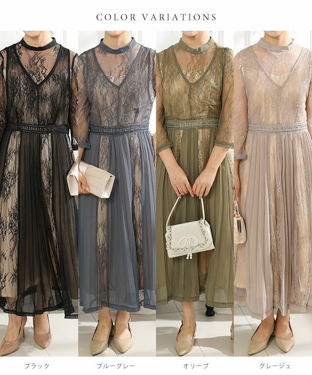 プリーツ ドッキング フェイクレイヤード シアー ワンピース 女性 レディース スカート ドレス 春 夏 秋 冬 7分袖 重ね着 プチハイネック Vネック クラシカル 華やか エレガント 透け感 レース ロマンチック レトロ 上品 大人 ロング マキシ