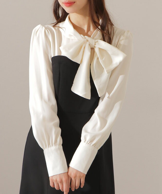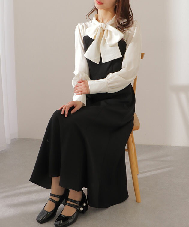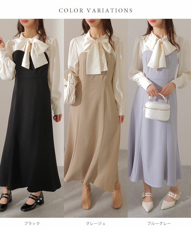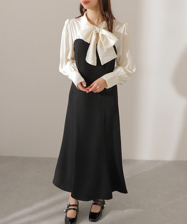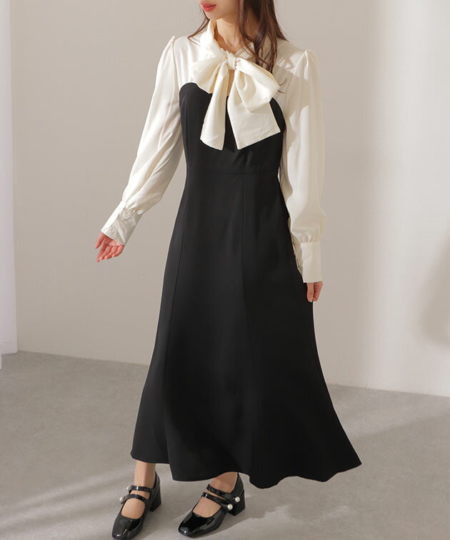 ボウタイ付き ハートネック ドッキング マキシ ワンピース 女性 レディース スカート オールインワン ロング 単色 無地 お嬢様 清楚 上品 リボン 重ね着風 フェイクレイヤード ブラウス エレガント ガーリー オケージョン