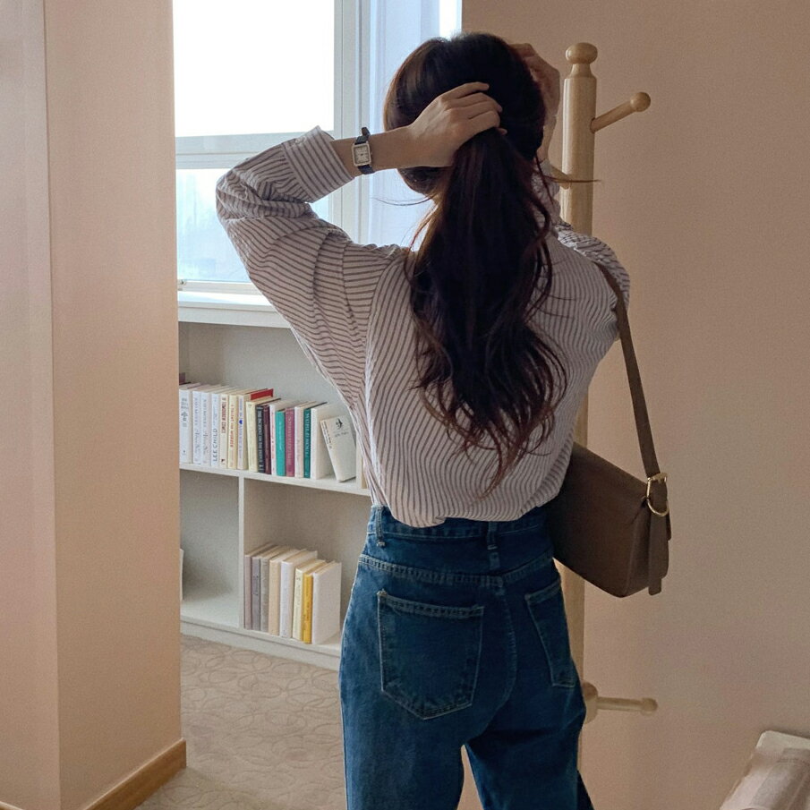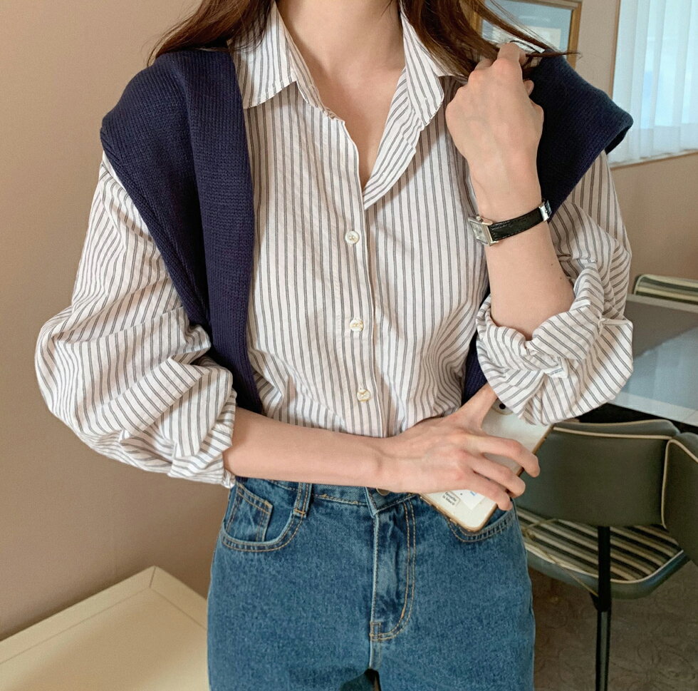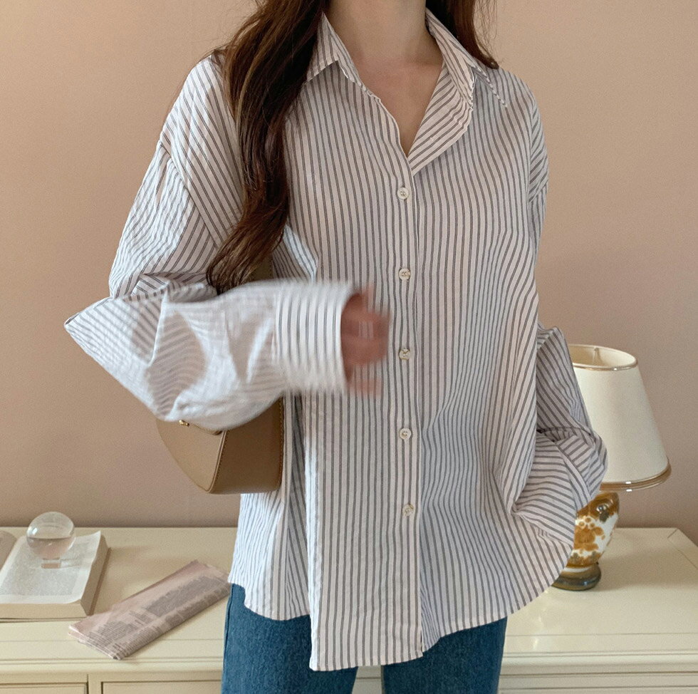 ストライプパターンシャツ・p418988 レディース 【bl】シャツ トップス 長袖 柄 模様 ストライプ 襟 えり ボタン ぼたん 秋 冬 春 カジュアル パステル 爽やか かわいい 可愛い 大人 水色 スカイブルー 韓国ファッション STYLE
