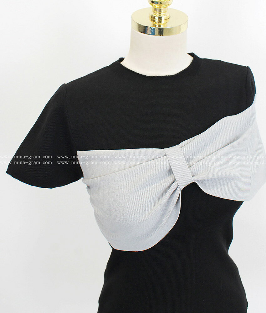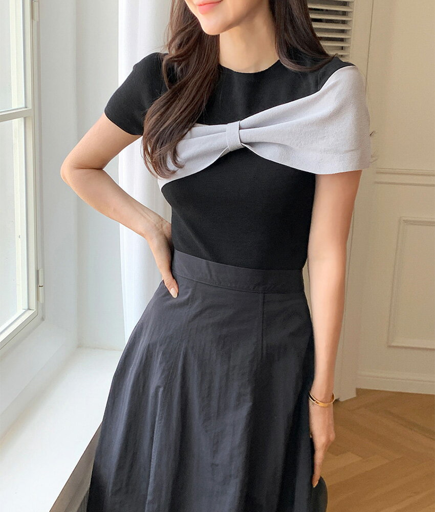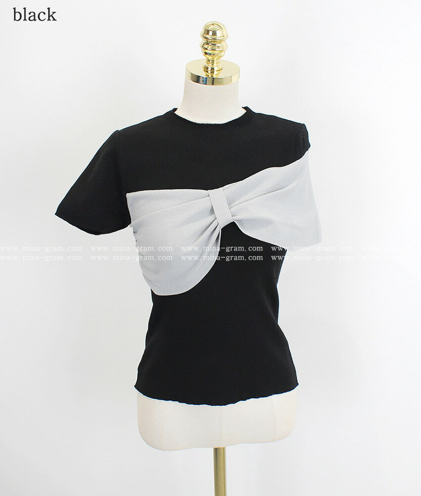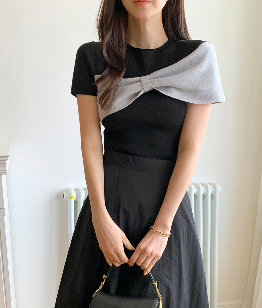 [0417NEW] kn レディース 韓国ファッション トップス ニット 半袖 ラウンドネック リボンポイント クロップド 伸びる スリム シンプル シック 上品 フェミニン カジュアル オケージョン 着回し 春 夏 SSMINA