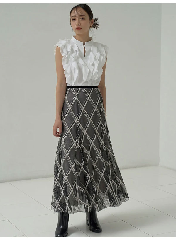 【期間限定 SALE10%OFF】 【即納】 スナイデル SNIDEL スカート 24秋冬 エンブロイダリーチェックチュールスカート ロング丈 Aライン フレア チェック 刺繍 swfs244071