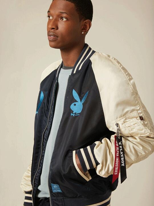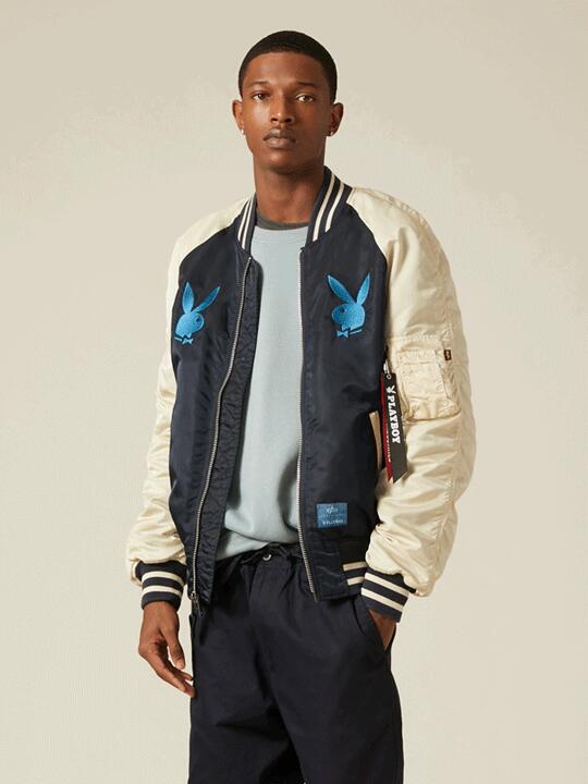 アルファインダストリー x プレイボーイ コラボ ジャケット 限定 PLAYBOY MULTI STACK BOMBER JACKET ボンバー ジャケット スカジャン レプリカブルー ミリタリー ジャンバー ユニセックスおしゃれ アメカジ お出かけ デート カジュアル