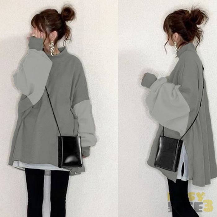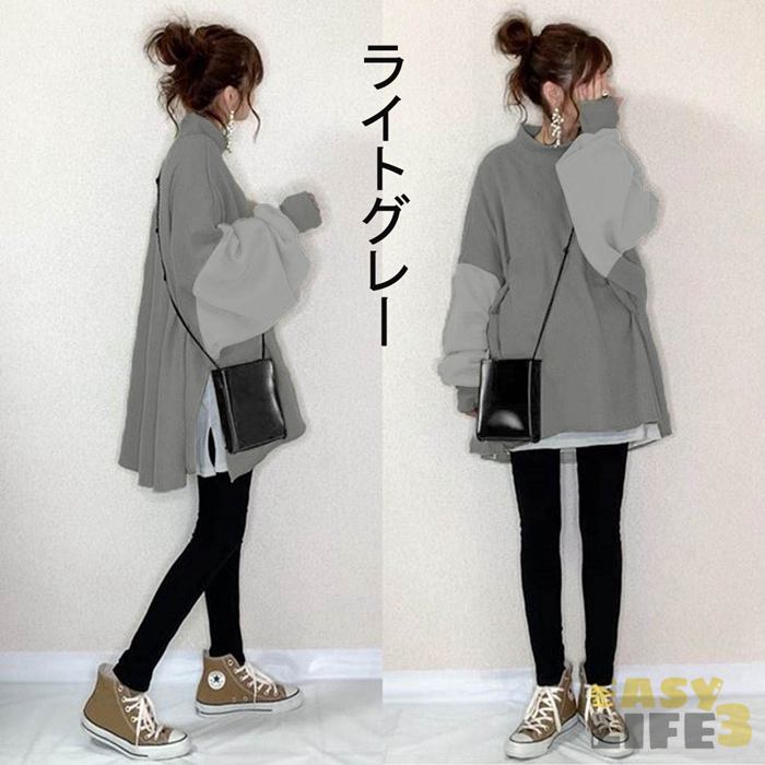 トレーナー 長袖 春服 レディース 切替 スリット かわいい モックネック ミモレ丈 ゆったり 体型カバー おしゃれ 秋服 春 秋 長袖トレーナー 通勤 通学 きれいめ ハイネック 秋冬 スウェット プルーオーパ シンプル OL オフィス 20代 30代 40代 50代 オーバーサイズ