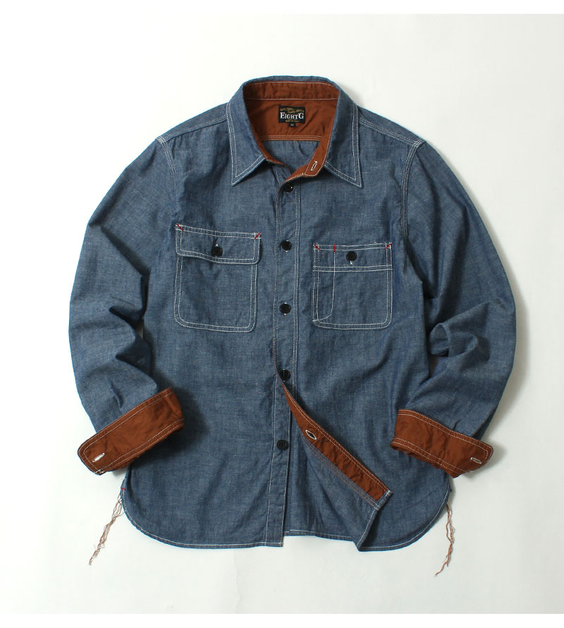 【先行予約】 エイトジー 袖裏付きシャンブレーシャツ 復刻モデル 2025春夏 新作 ワークシャツ 長袖 日本製 アメカジ メンズ 大人 おしゃれ インディゴブルー S-XL EIGHT-G 8LS-13