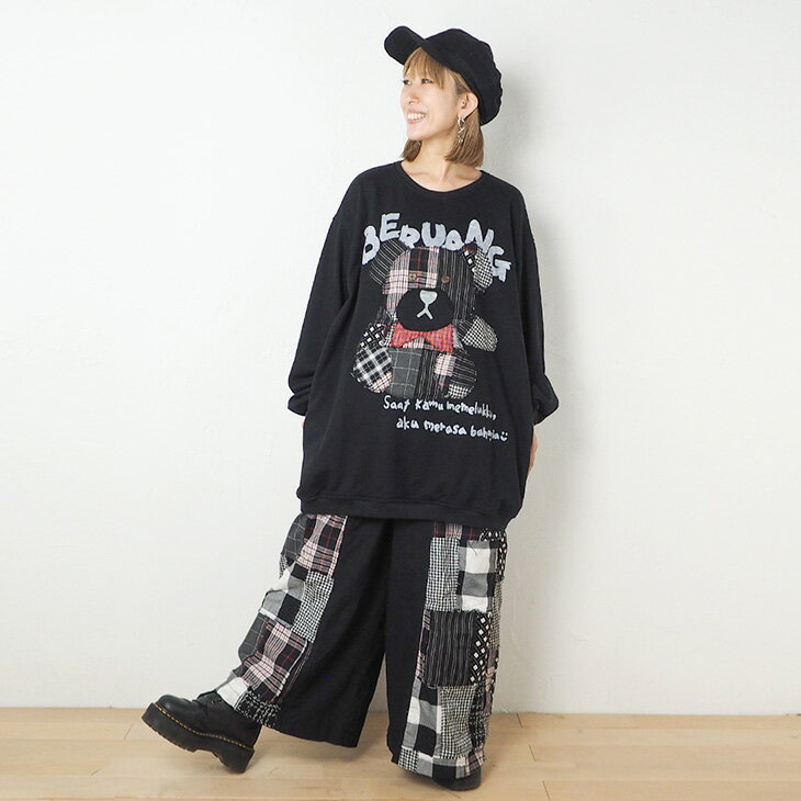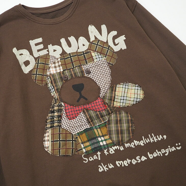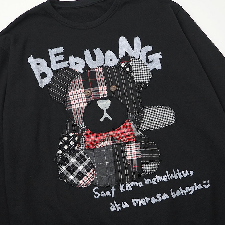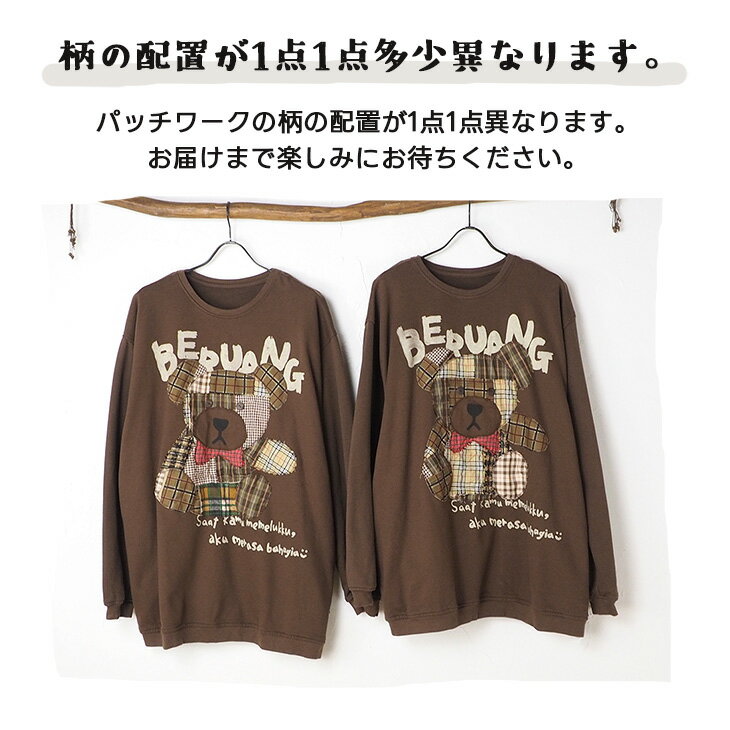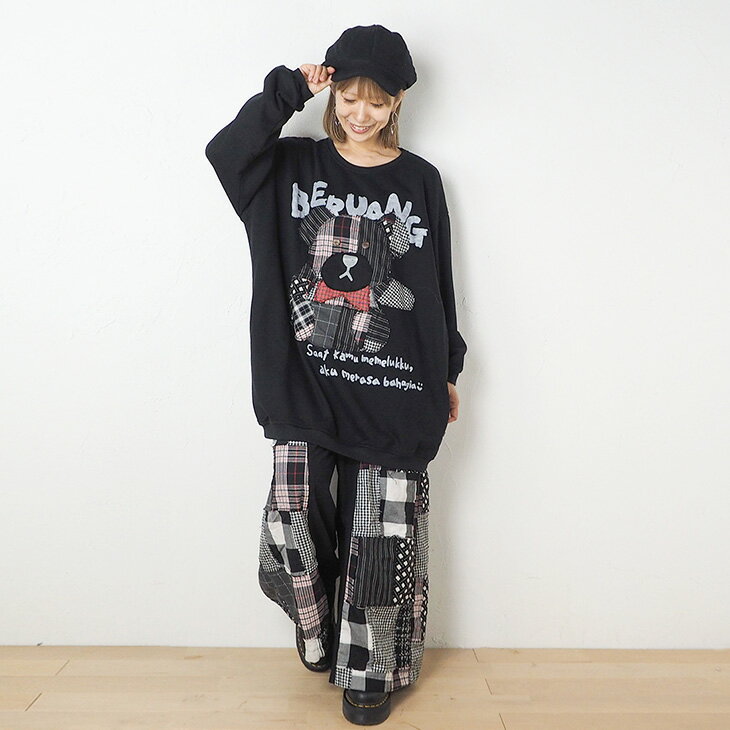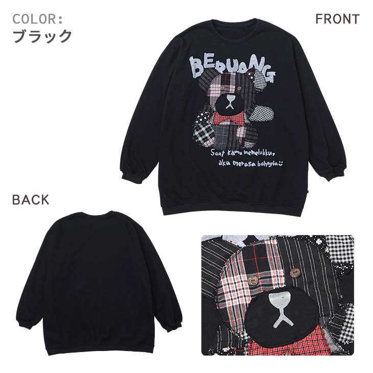 送料無料 チェック柄クマさんアップリケ トレーナー レディース トップス 長袖 スウェット ビッグ ゆったり 大きい オーバーサイズ ガーリー レトロ 可愛い カジュアル パッチワーク