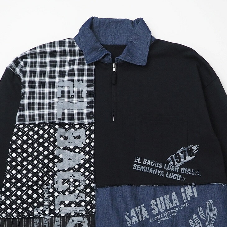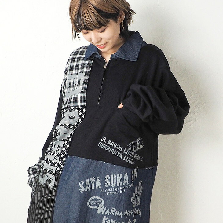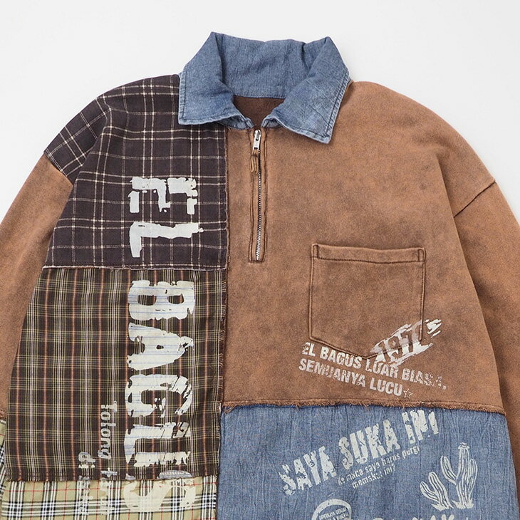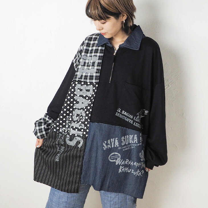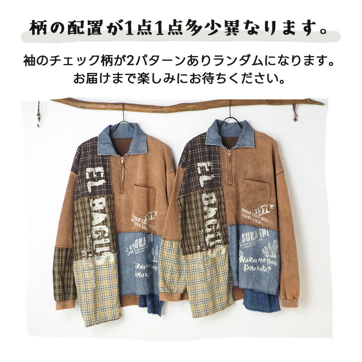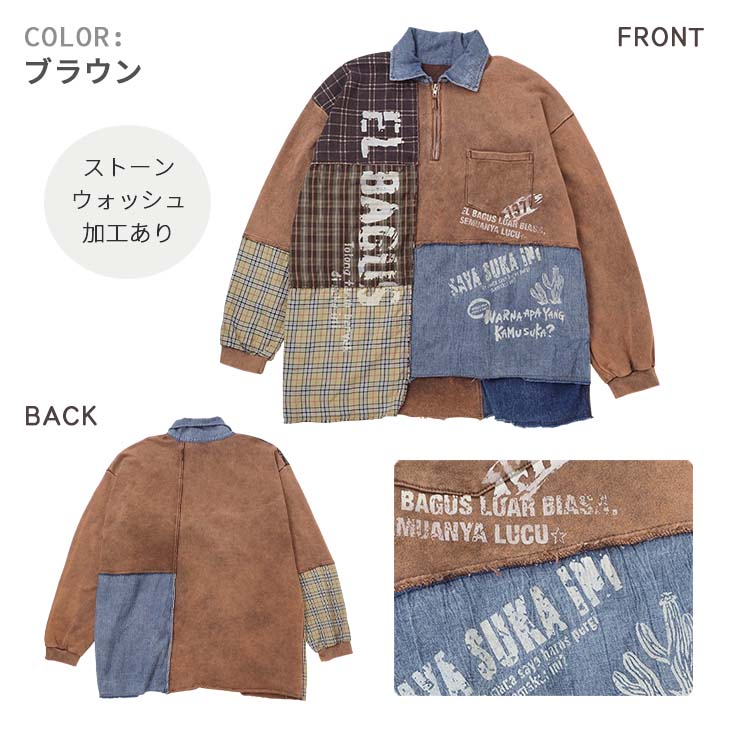 送料無料 EL BAGUS(エルバグース)チェック切り替え襟付きトレーナー レディース トップス 長袖 スウェット 大人 カジュアル ユニセックス メンズ ゆったり 大きい オーバーサイズ 古着系 リメイク風