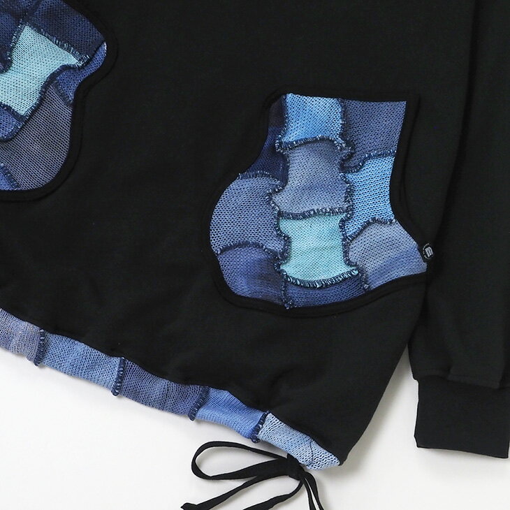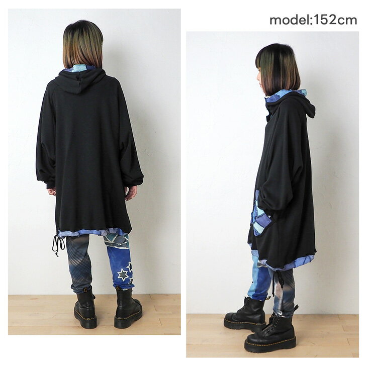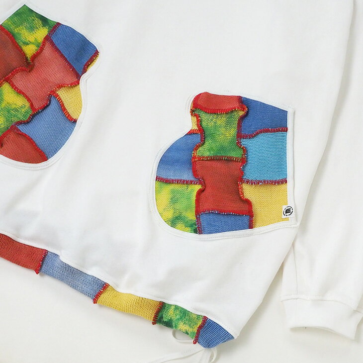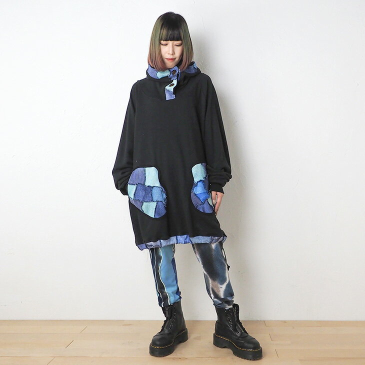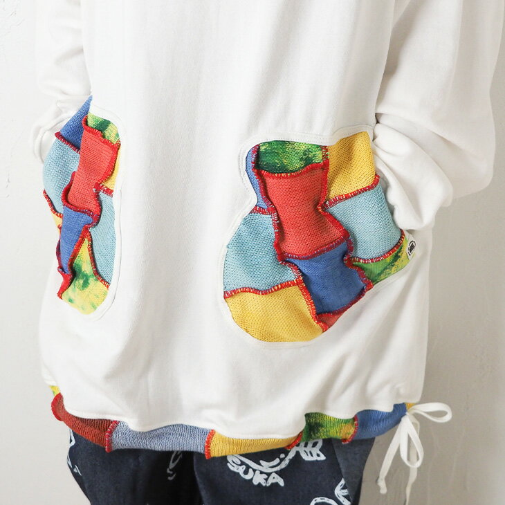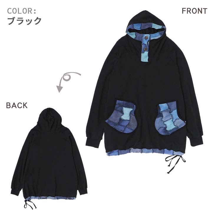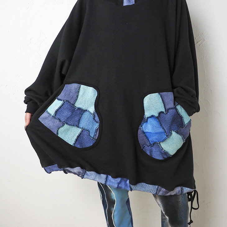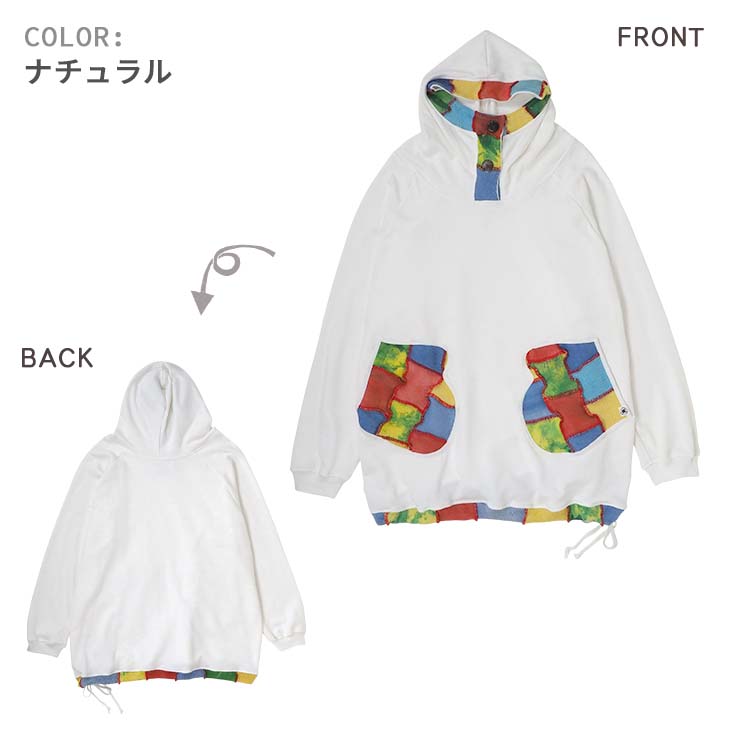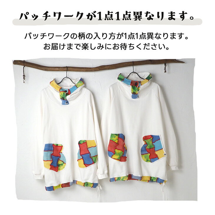 送料無料 コットンニット ミトンポッケ パーカートレーナー パッチワーク カラフル レディース トップス 長袖 スウェット フード ロング丈 ゆったり 大きい オーバーサイズ 体型カバー カジュアル エスニック 個性的ファッション