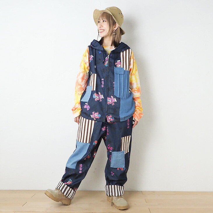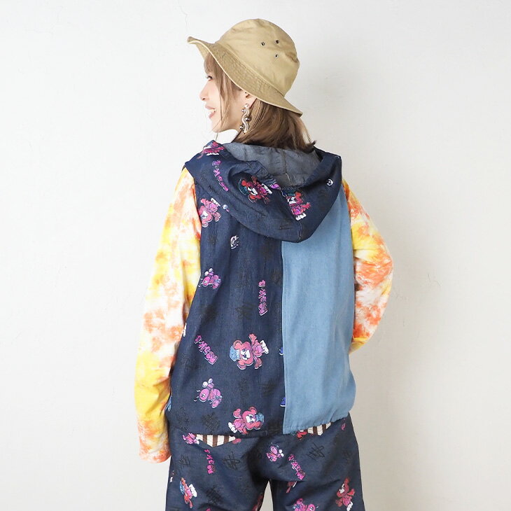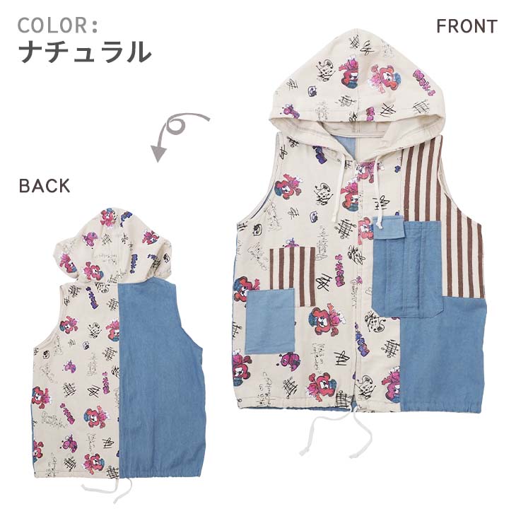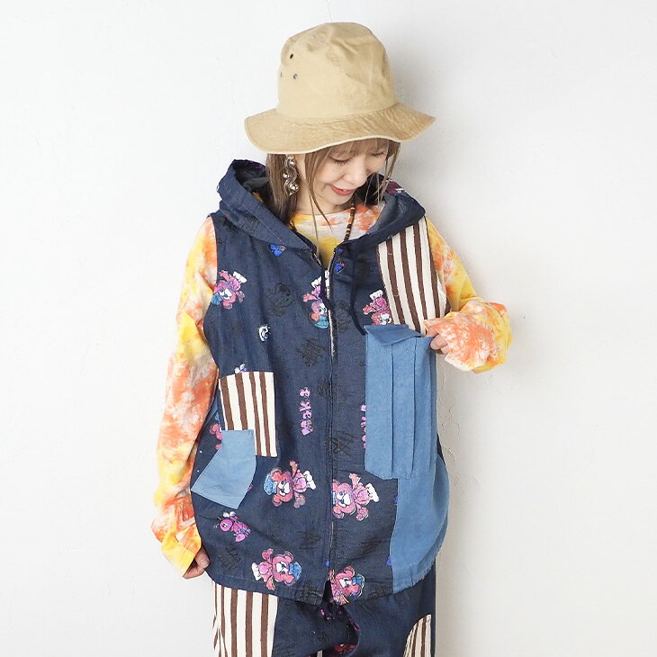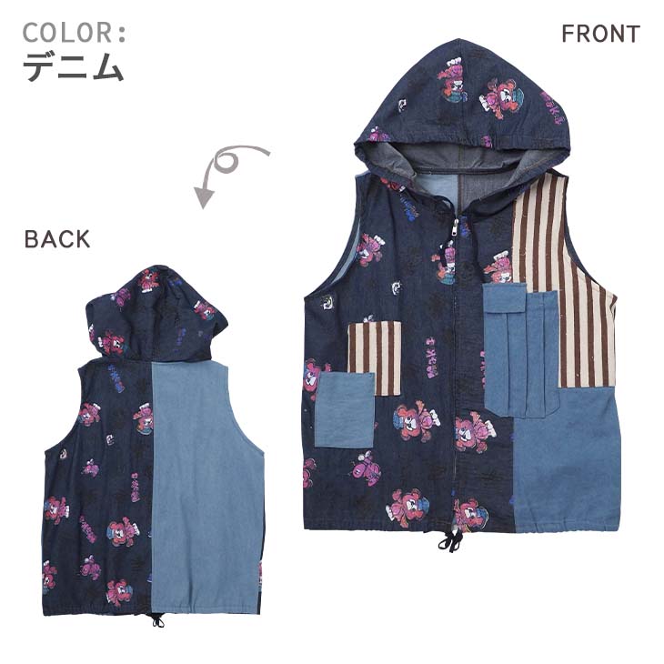 送料無料 KiiTOS(キートス)くまコック柄×ストライプ パーカーベスト レディース トップス 重ね着 レイヤード デニム 切り替え カジュアル ポップ 可愛い スポーティ セットアップ可 古着系 ゆったり ゆるダボ