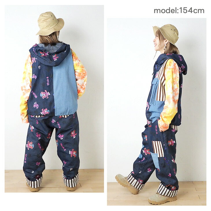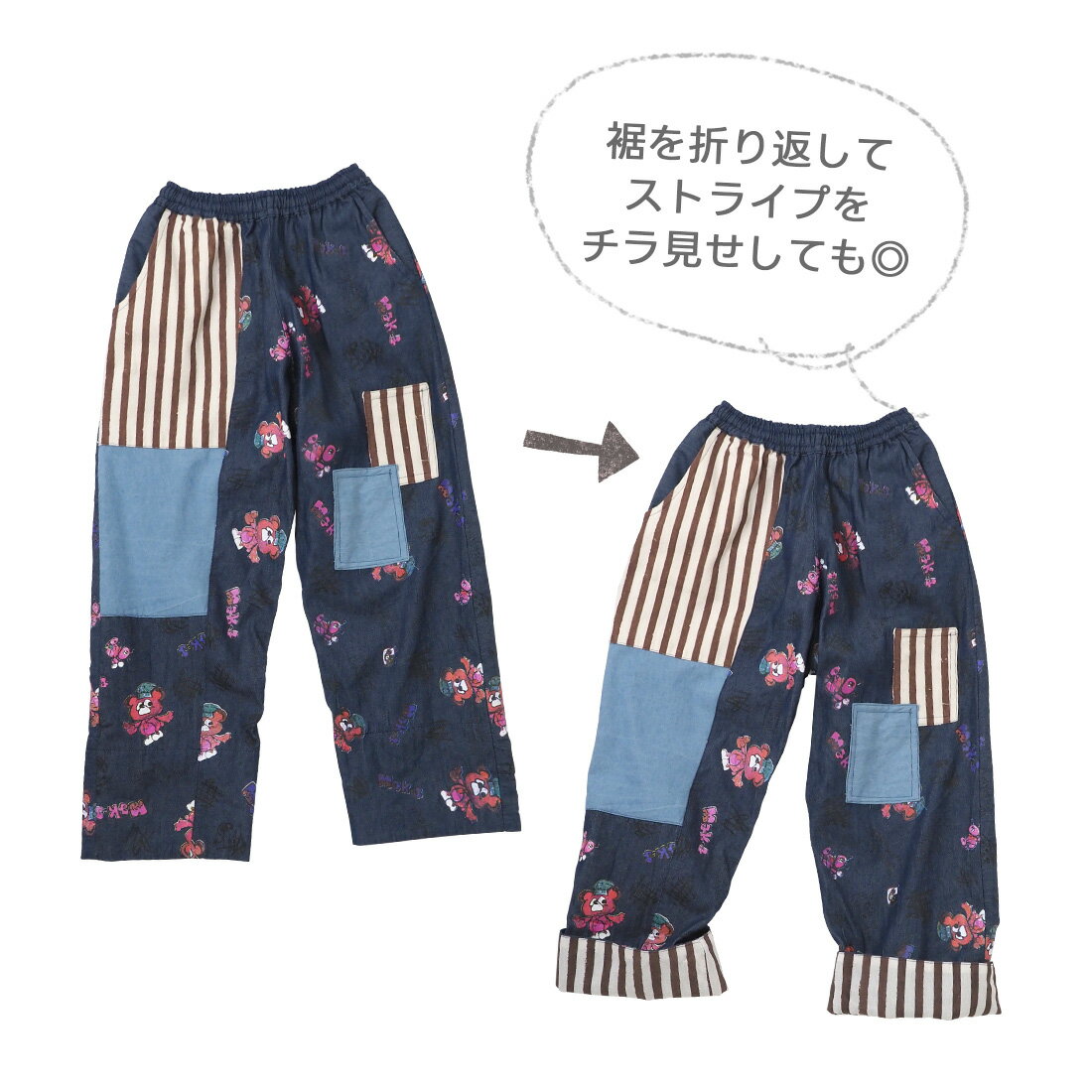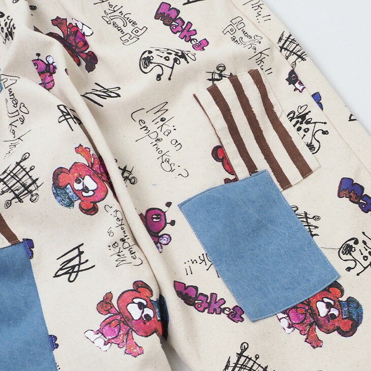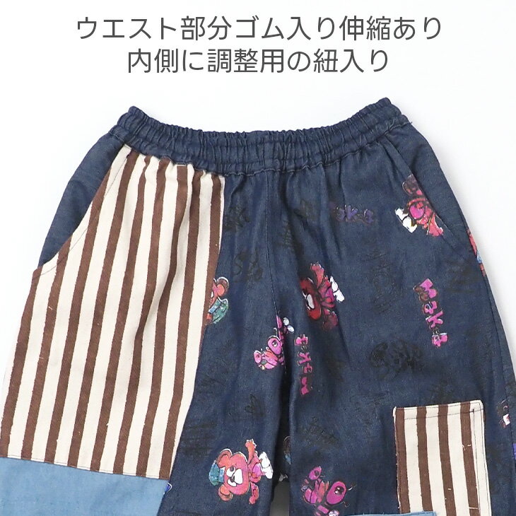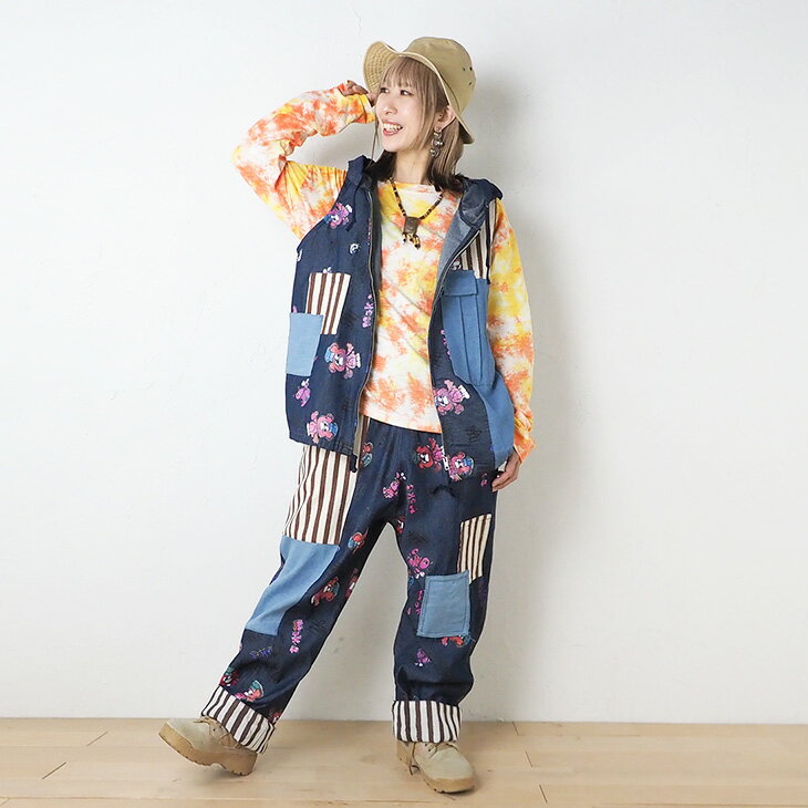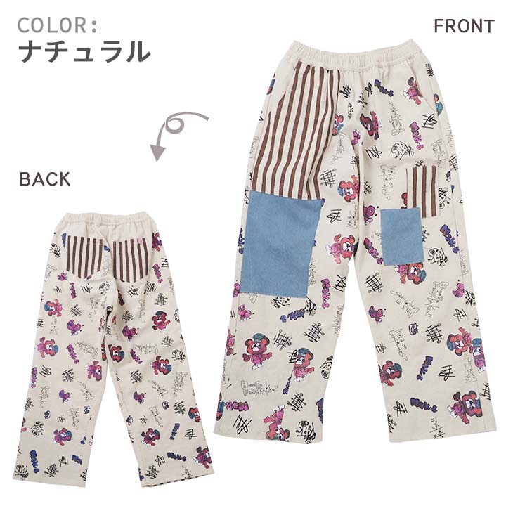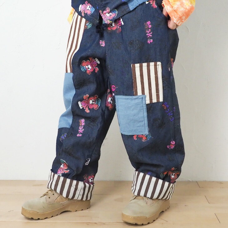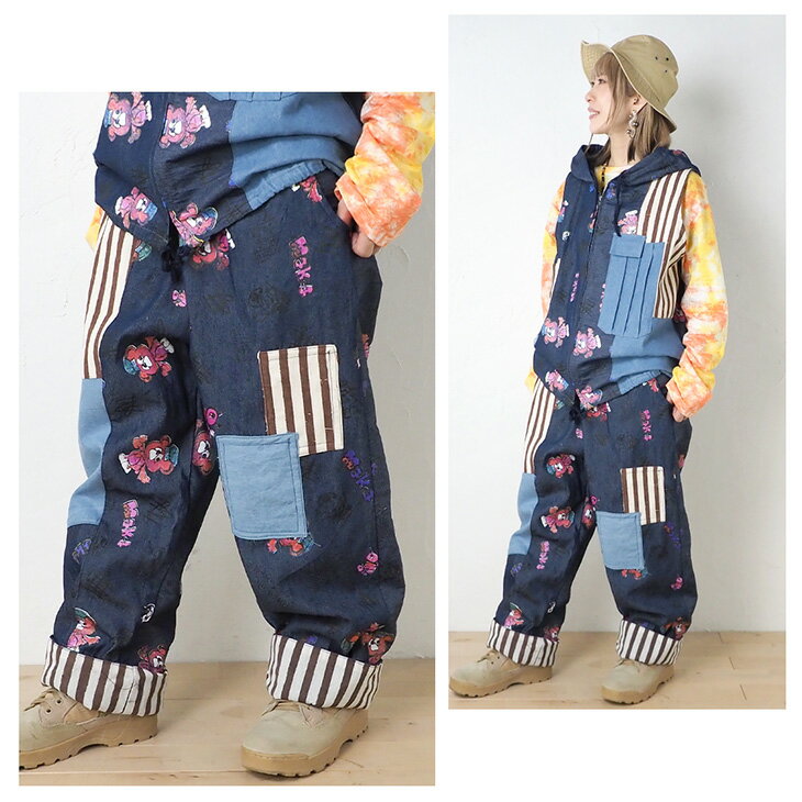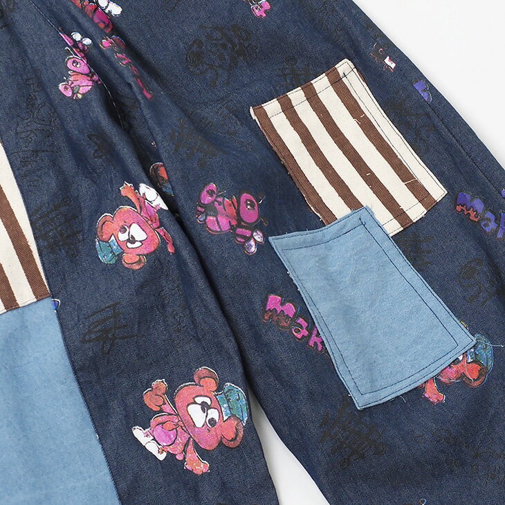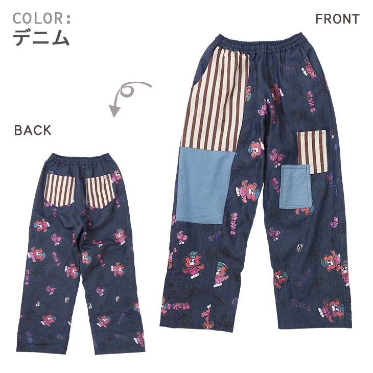 送料無料 KiiTOS(キートス)くまコック柄×ストライプ ラフパンツ レディース ボトムス アップリケ ポケット 総柄 総プリント 切り替え カジュアル ゆるダボ ゆったり ユニセックス デニム キャンバス ウエストゴム セットアップ可