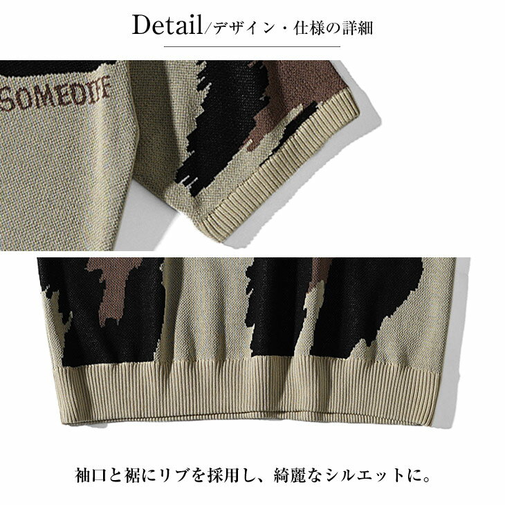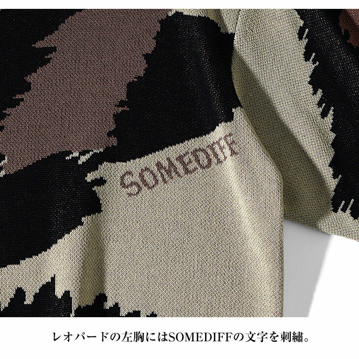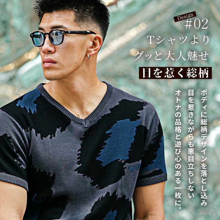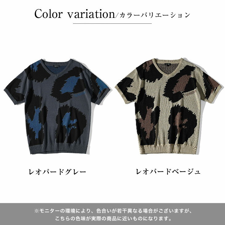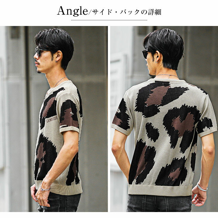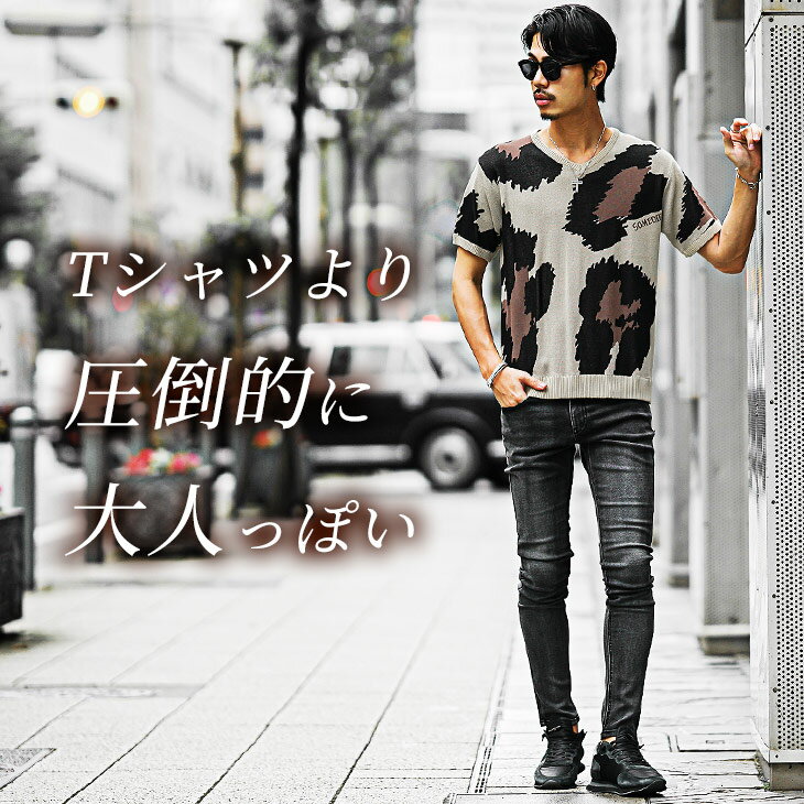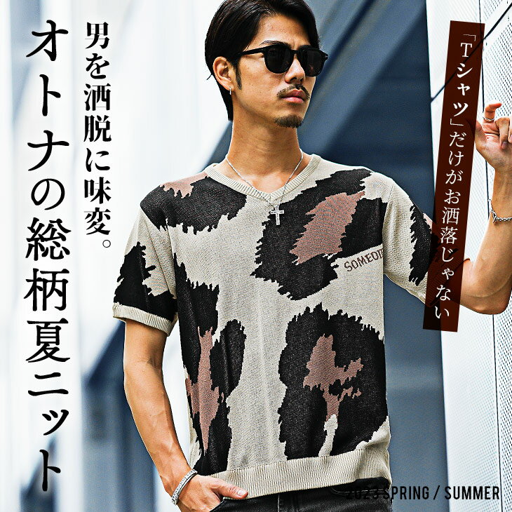 サマーニット メンズ サマーセーター 総柄 サマーニット 半袖 ニット セーター ニットTシャツ ニットセーター トップス 薄手 涼しい 薄手 ヒョウ柄 白 黒 ホワイト ブラック Uネック クルーネック 夏 夏服 夏物 春夏 メンズファッション リゾート サーフ系 ちょいワル お兄系
