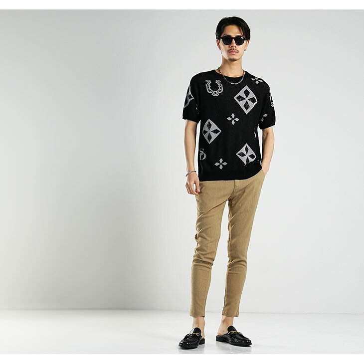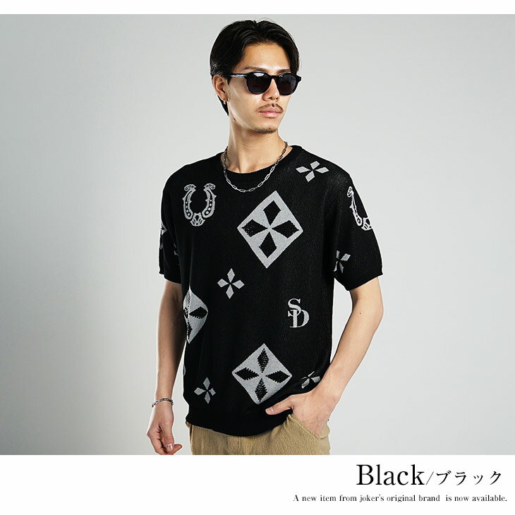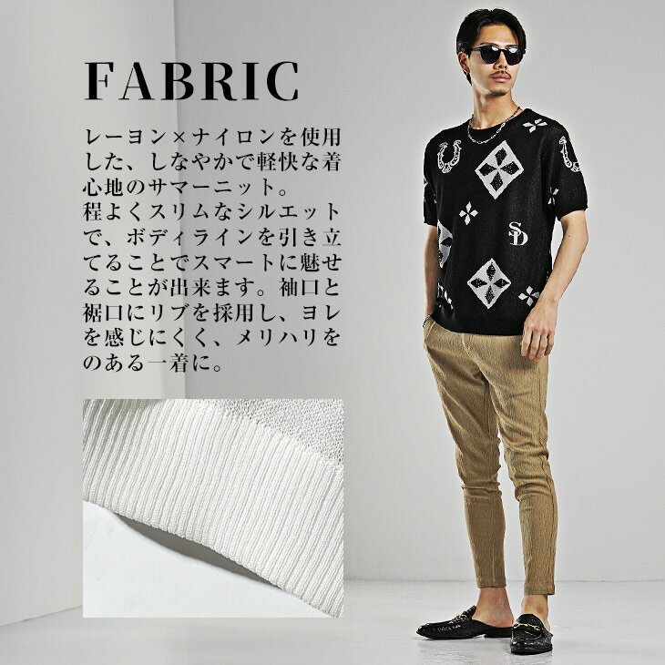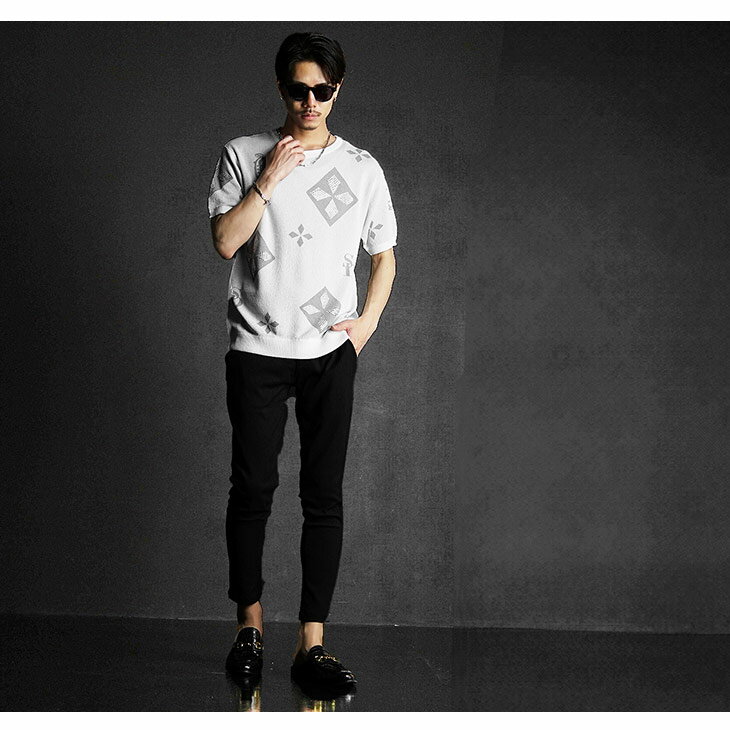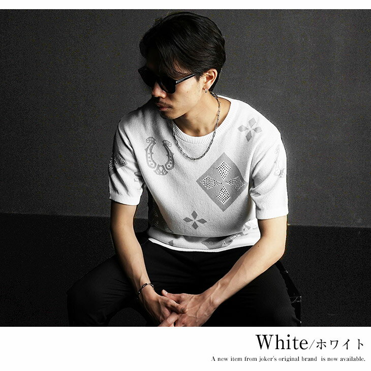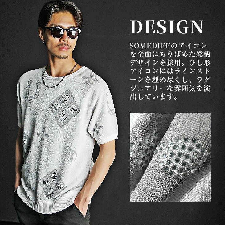 サマーニット メンズ サマーセーター 総柄 春 ニット 半袖 ニット セーター ニットTシャツ ニットセーター トップス 薄手 涼しい 薄手ラインストーン 白 黒 ホワイト ブラック クルーネック 夏 夏服 夏物 春夏 メンズファッション リゾート サーフ系 ちょいワル お兄系