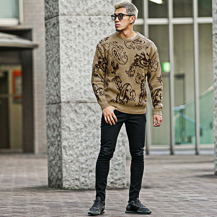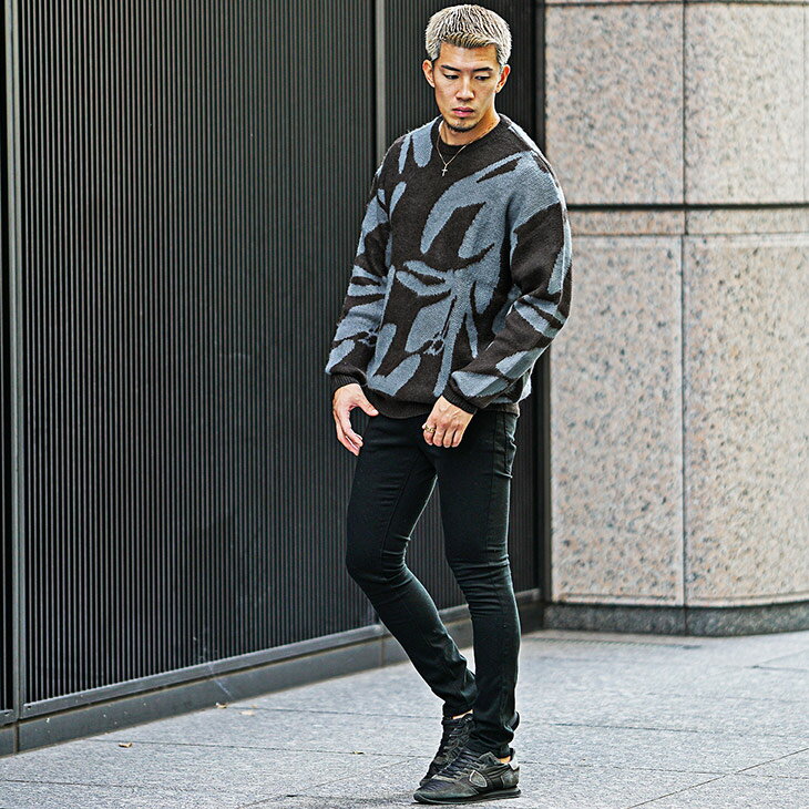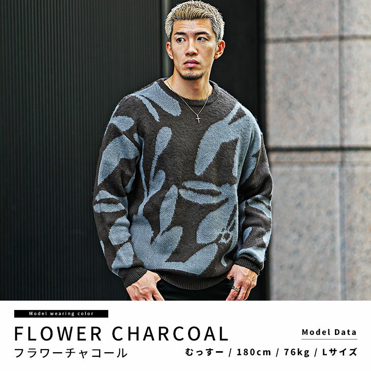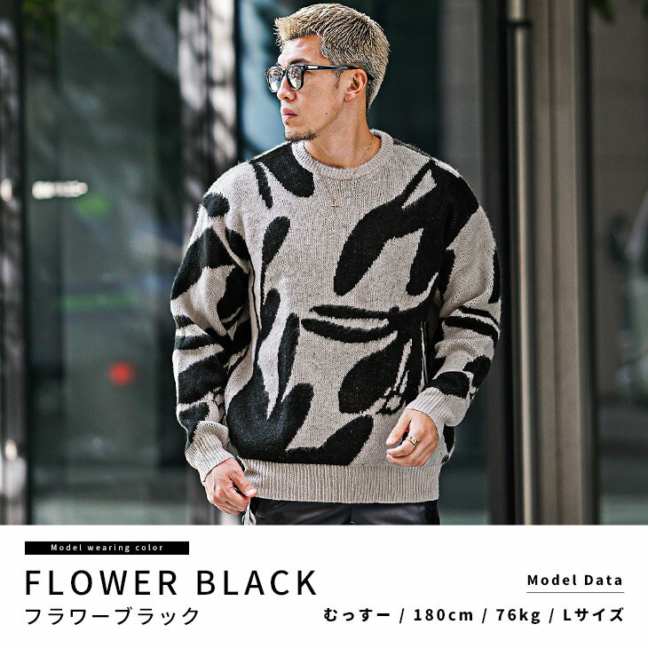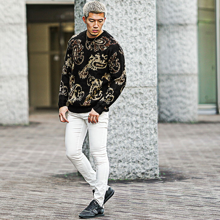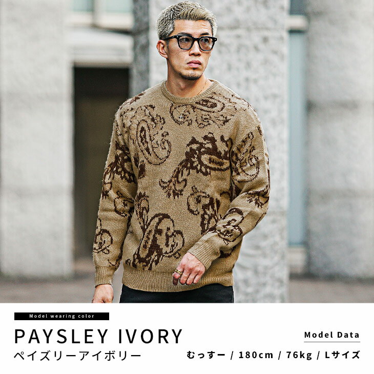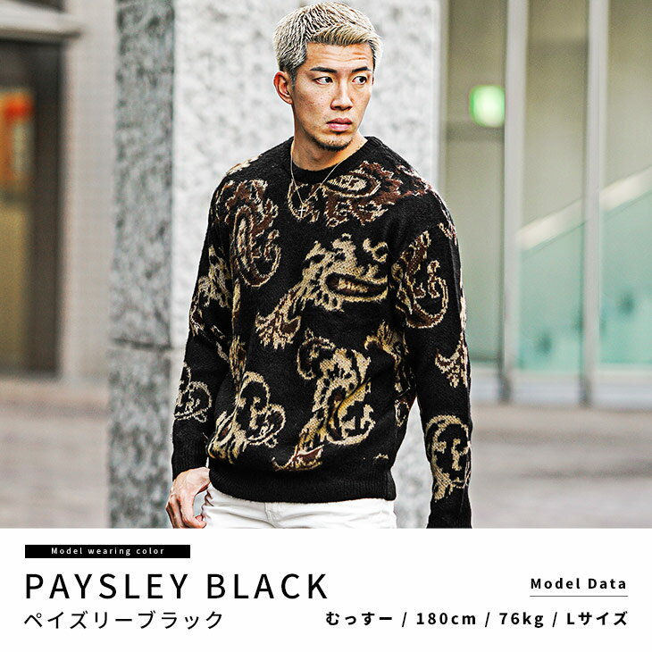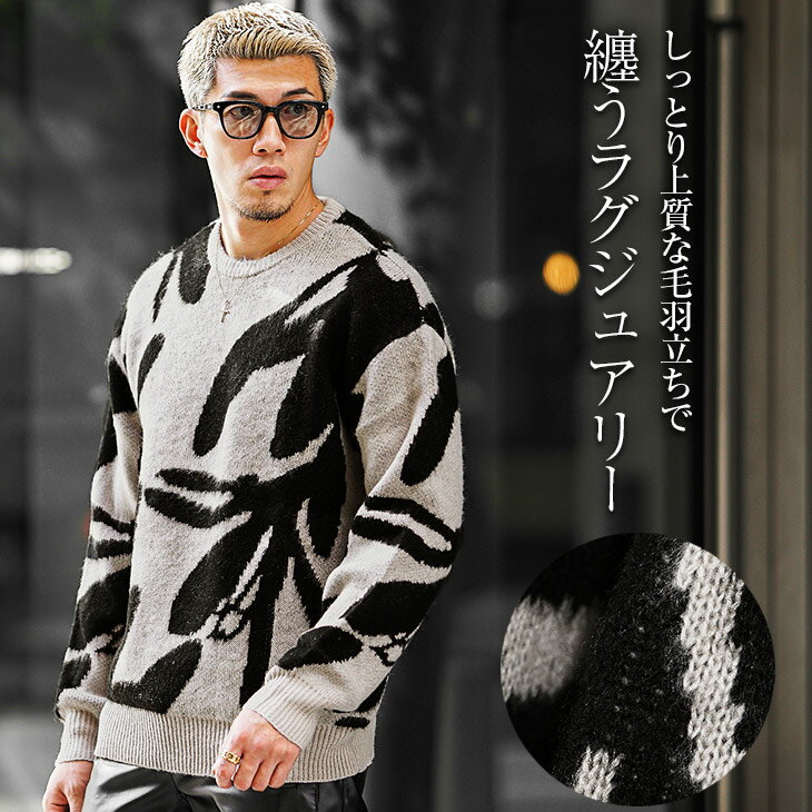 ニット メンズ オーバーサイズ ブランド モヘア ニット セーター おしゃれ メンズ ビッグシルエット ニット メンズ 秋 長袖 総柄 黒 アイボリー グレー 花柄 ペイズリー柄 派手 肉厚 大きいサイズ XL LL 秋 秋服 秋物 秋冬 メンズファッション ちょいワル オラオラ系