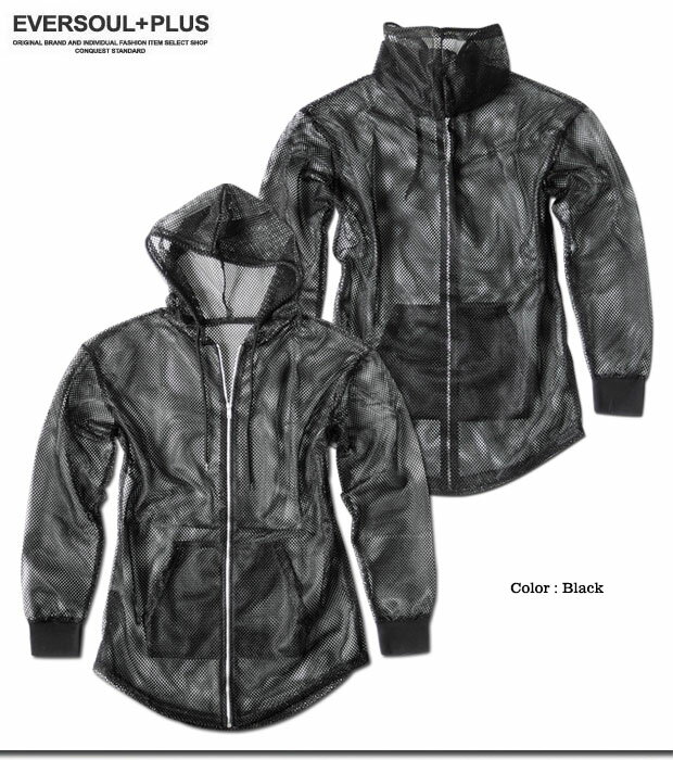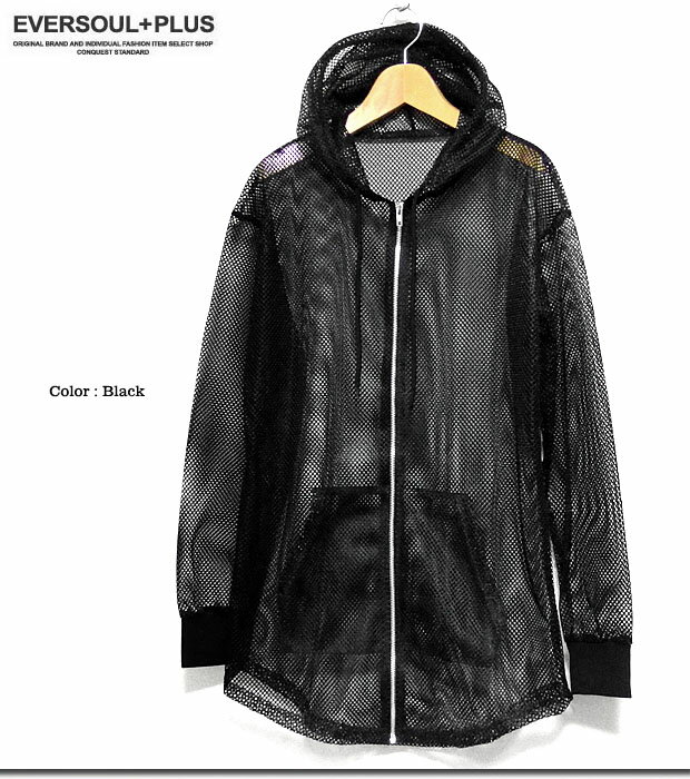 【クロネコゆうパケット便で送料無料!!】ジップパーカー メンズ メッシュ シースルー パーカー ロング丈 ブラック 黒 ビジュアル系 バンド 衣装 韓国ファッション ジップアップ ロングパーカー メンズファッション おしゃれ
