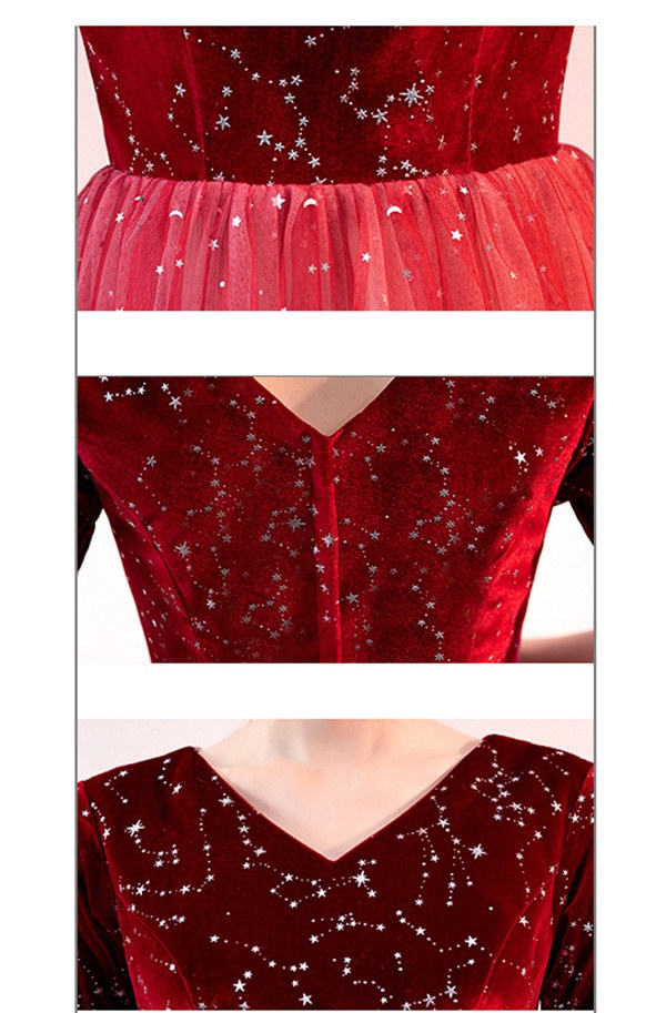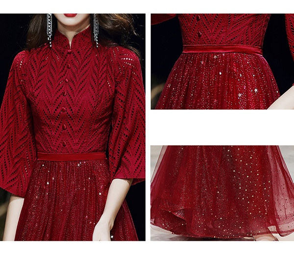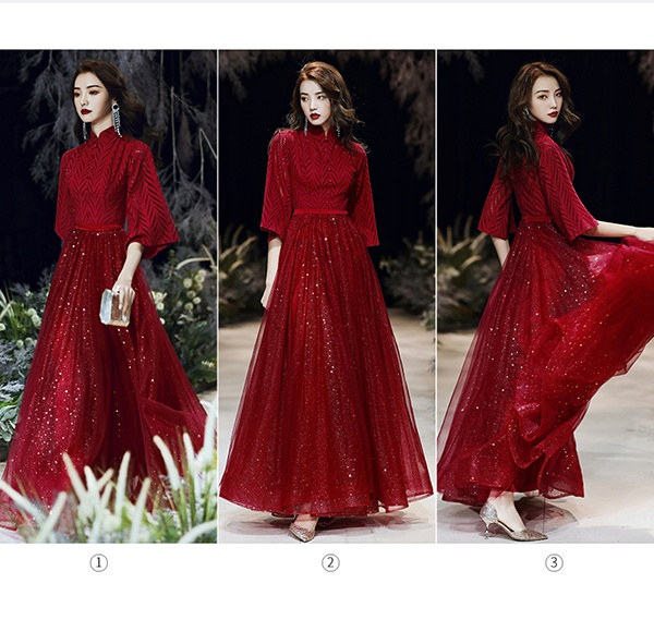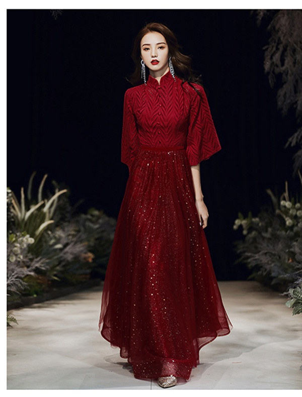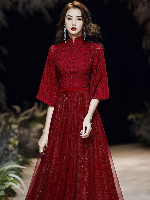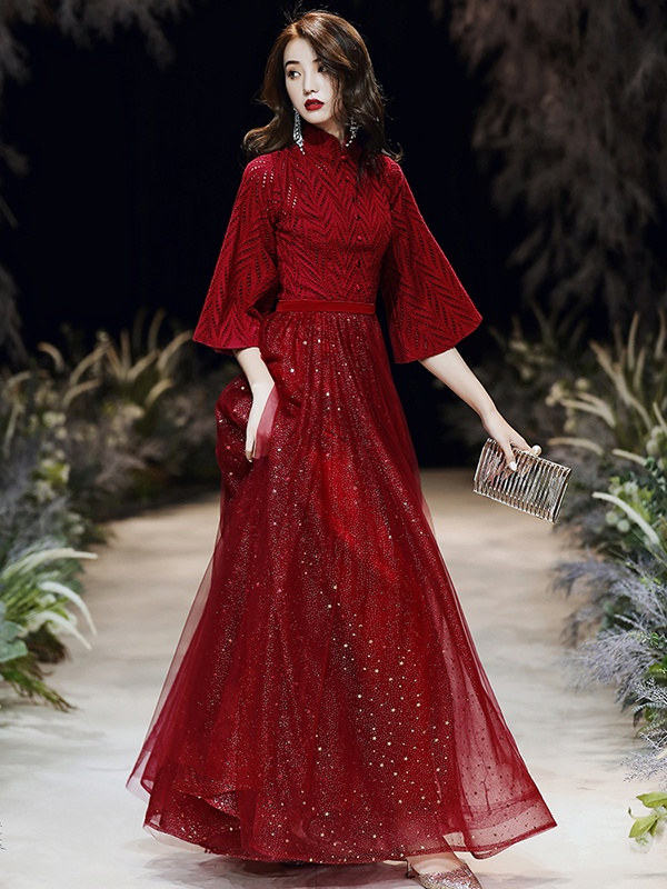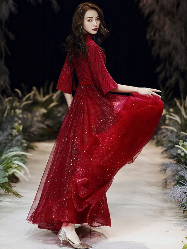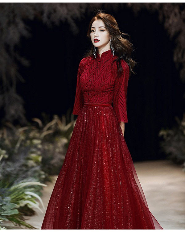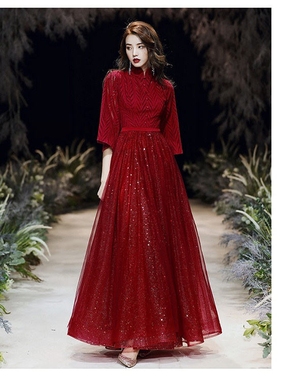 袖付き ロングドレス 母親 結婚式 ドレス 大人 ピアノ 発表会 演奏会用 ハイネック 演奏会 他と被らない キラキラ 大きいサイズ かわいい パーティードレス 演奏会 二次会 花嫁 ワインレッド