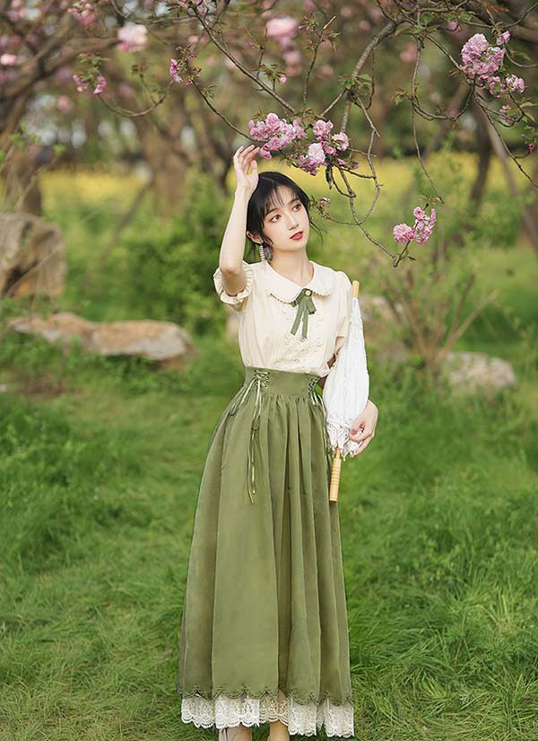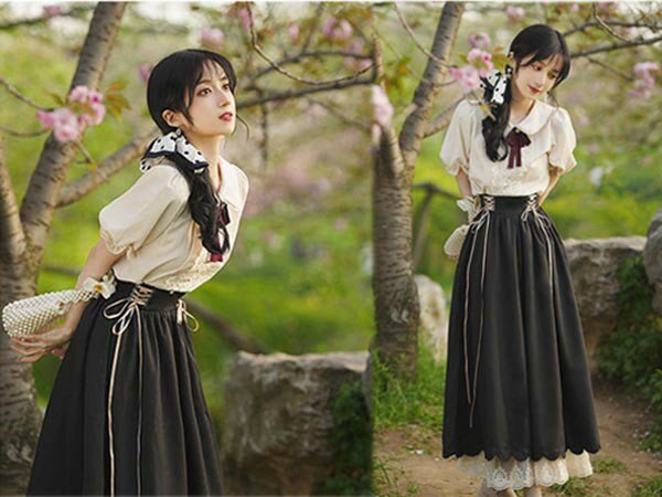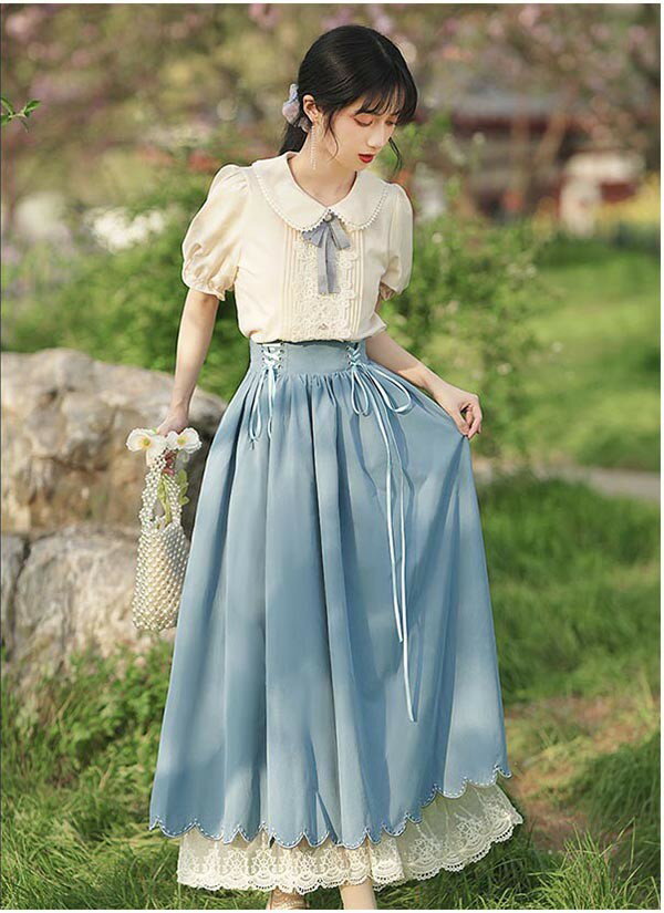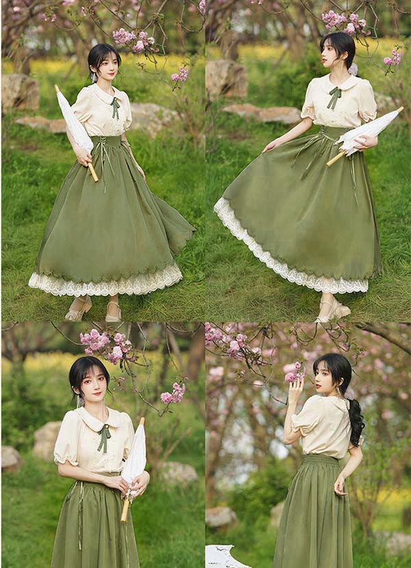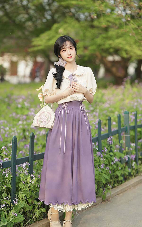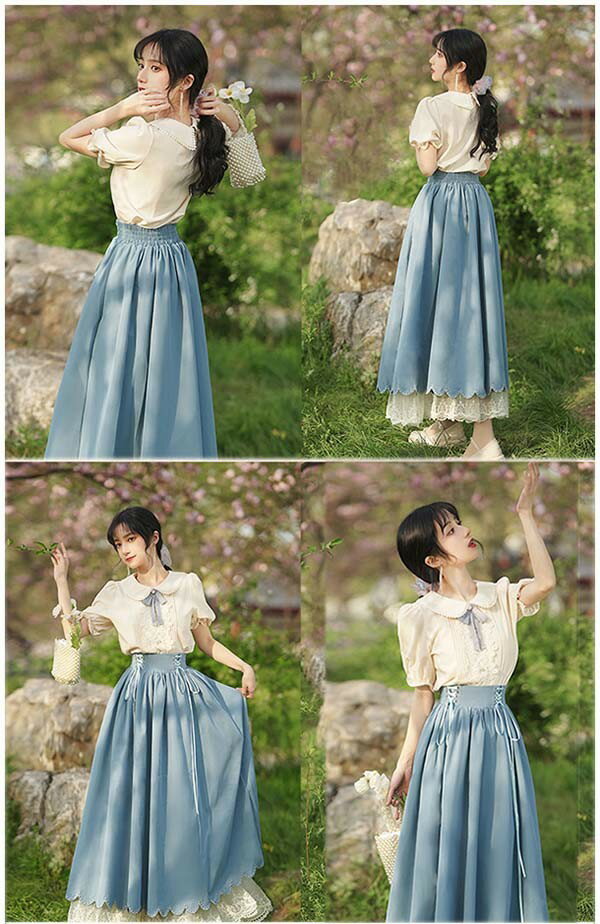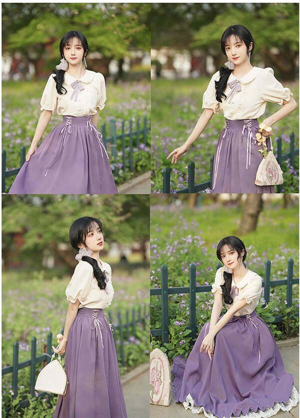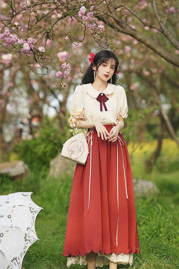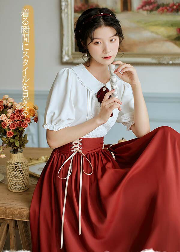 洋服 ロリータ ブラウス ピーターパンカラー 長袖 半袖 フレアスカート ロングスカート パワーショルダー キャンディスリーブ リボン レディース ロング 可愛い lolita 日常可 春 秋 夏 赤 紫 緑 青 黒 XS S M L XL dg311t2t2t2