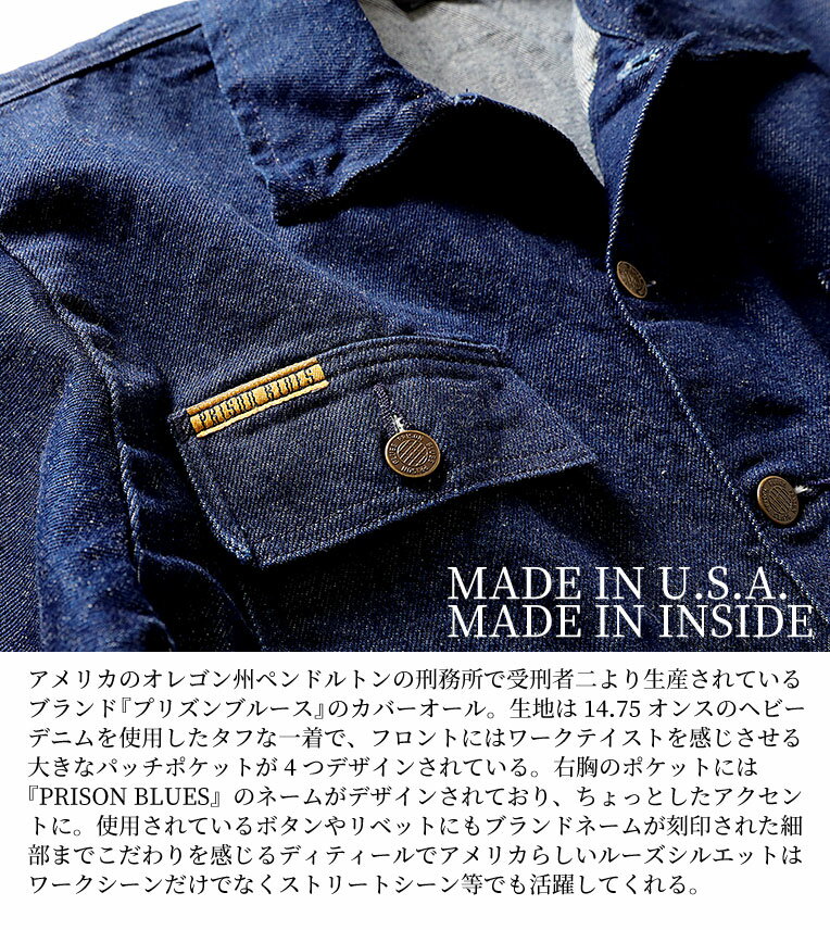 PRISON BLUES / プリズンブルース PRBS199 YARD COAT / ヤードコート -全3色- USA デニム カバーオール ワンウォッシュ リジッド リンスド 未洗いメタルボタン リベット ポケット ネームタグ メンズ 大きいサイズ US規格 オーバーサイズ [PRBS199]